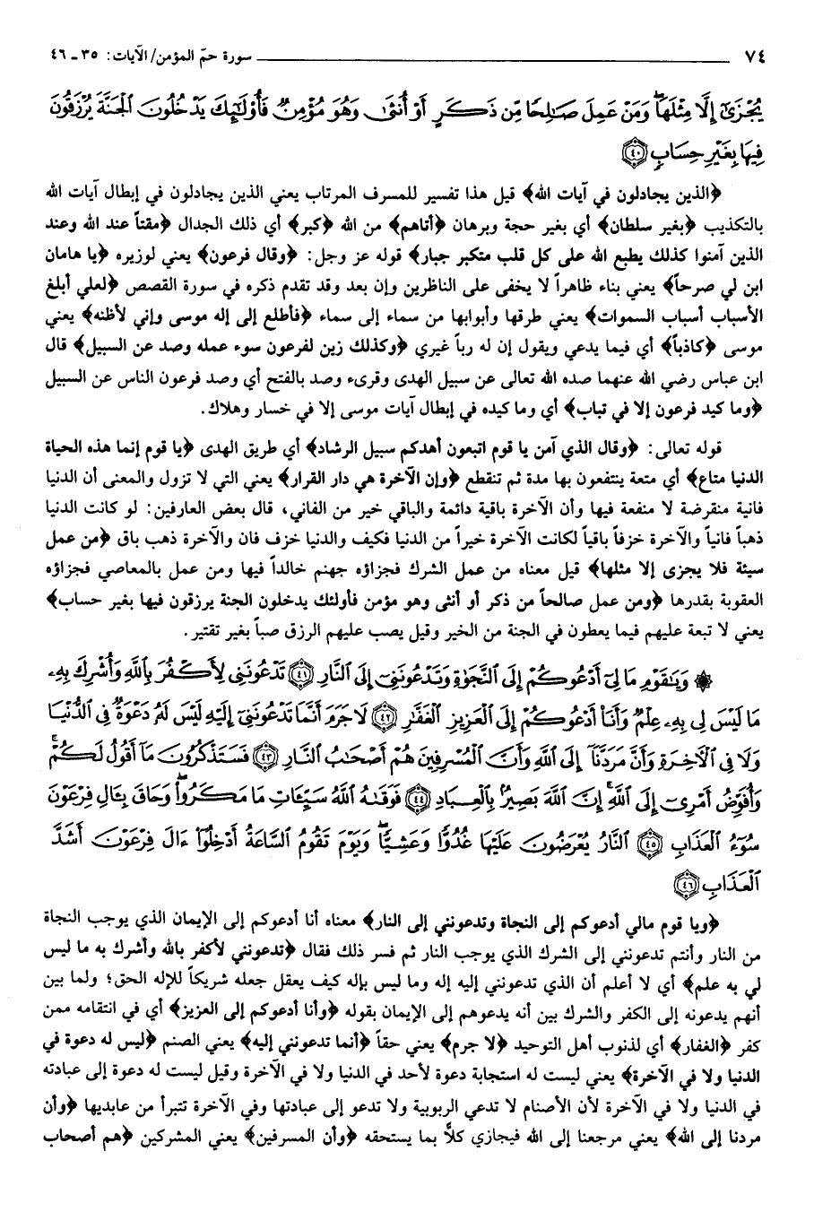 الَّذِينَ يُجادِلُونَ فِي آياتِ اللَّهِ بِغَيْرِ سُلْطانٍ أَتاهُمْ كَبُرَ مَقْتاً عِنْدَ اللَّهِ وَعِنْدَ الَّذِينَ آمَنُوا كَذلِكَ يَطْبَعُ اللَّهُ عَلى كُلِّ قَلْبِ مُتَكَبِّرٍ جَبَّارٍ (35) وَقالَ فِرْعَوْنُ يا هامانُ ابْنِ لِي صَرْحاً لَعَلِّي أَبْلُغُ الْأَسْبابَ (36) أَسْبابَ السَّماواتِ فَأَطَّلِعَ إِلى إِلهِ مُوسى وَإِنِّي لَأَظُنُّهُ كاذِباً وَكَذلِكَ زُيِّنَ لِفِرْعَوْنَ سُوءُ عَمَلِهِ وَصُدَّ عَنِ السَّبِيلِ وَما كَيْدُ فِرْعَوْنَ إِلاَّ فِي تَبابٍ (37) وَقالَ الَّذِي آمَنَ يا قَوْمِ اتَّبِعُونِ أَهْدِكُمْ سَبِيلَ الرَّشادِ (38) يا قَوْمِ إِنَّما هذِهِ الْحَياةُ الدُّنْيا مَتاعٌ وَإِنَّ الْآخِرَةَ هِيَ دارُ الْقَرارِ (39)