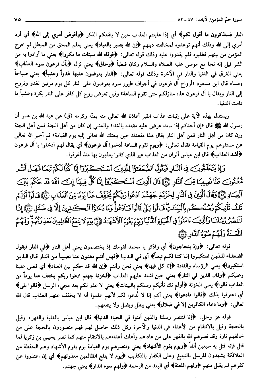 وَإِذْ يَتَحاجُّونَ فِي النَّارِ فَيَقُولُ الضُّعَفاءُ لِلَّذِينَ اسْتَكْبَرُوا إِنَّا كُنَّا لَكُمْ تَبَعاً فَهَلْ أَنْتُمْ مُغْنُونَ عَنَّا نَصِيباً مِنَ النَّارِ (47) قالَ الَّذِينَ اسْتَكْبَرُوا إِنَّا كُلٌّ فِيها إِنَّ اللَّهَ قَدْ حَكَمَ بَيْنَ الْعِبادِ (48) وَقالَ الَّذِينَ فِي النَّارِ لِخَزَنَةِ جَهَنَّمَ ادْعُوا رَبَّكُمْ يُخَفِّفْ عَنَّا يَوْماً مِنَ الْعَذابِ (49) قالُوا أَوَلَمْ تَكُ تَأْتِيكُمْ رُسُلُكُمْ بِالْبَيِّناتِ قالُوا بَلى قالُوا فَادْعُوا وَما دُعاءُ الْكافِرِينَ إِلاَّ فِي ضَلالٍ (50) إِنَّا لَنَنْصُرُ رُسُلَنا وَالَّذِينَ آمَنُوا فِي الْحَياةِ الدُّنْيا وَيَوْمَ يَقُومُ الْأَشْهادُ (51)