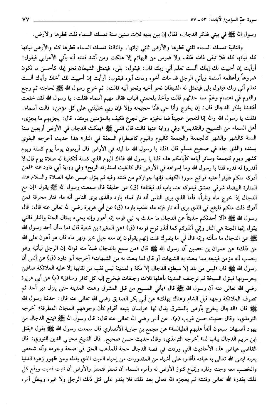 فقلت يا رسول الله والله إنا لنعجن عجينا فما نخبزه حتى نجوع فكيف بالمؤمنين يومئذ، قال: يجزيهم ما يجزئ أهل السماء من التسبيح والتقديس» وفي رواية عنها قالت قال النبي صلّى الله عليه وسلّم «يمكث الدجال في الأرض أربعين سنة السنة كالشهر والشهر كالجمعة والجمعة كاليوم واليوم كاضطرام السعفة في النار» هذا حديث أخرجه البغوي بسنده والذي جاء في صحيح مسلم قال «قلنا يا رسول الله ما لبثه في الأرض قال أربعون يوما يوم كسنة ويوم كشهر ويوم كجمعة وسائر أيامه كأيامكم هذه قلنا يا رسول الله فذاك اليوم الذي كسنة أتكفينا له صلاة يوم قال لا اقدروا له قدره قلنا يا رسول الله وما إسراعه في الأرض قال كالغيث استذرته الريح» وفي رواية أبي داود عنه «فمن أدركه منكم فليقرأ عليه فواتح سورة الكهف فإنها جواركم من فتنته وفيه ثم ينزل عيسى عليه الصلاة والسلام عند المنارة البيضاء شرقي دمشق فيدركه عند باب لد فيقتله» (ق) عن حذيفة قال سمعت رسول الله صلّى الله عليه وسلّم يقول «إن مع الدجال إذا خرج ماء ونارا، فأما الذي يرى الناس أنه نار فماء بارد والذي يرى الناس أنه ماء فنار محرقة فمن أدرك ذلك منكم فليقع في الذي يرى أنه نار فإنه ماء عذب بارد» (ق) عن أبي هريرة رضي الله تعالى عنه قال: قال رسول الله صلّى الله عليه وسلّم «ألا أحدثكم حديثا عن الدجال ما حدث به نبي قومه إنه أعور وإنه يجيء بمثال الجنة والنار فالتي يقول إنها الجنة هي النار وإني أنذركم كما أنذر نوح قومه» (ق) «عن المغيرة بن شعبة قال «ما سأل أحد رسول الله صلّى الله عليه وسلّم عن الدجال ما سألته وإنه قال لي ما يضرك قلت إنهم يقولون إن معه جبل خبز ونهر ماء قال هو أهون على الله من ذلك» عن عمران بن حصين أن رسول الله صلّى الله عليه وسلّم قال «من سمع بالدجال فلينأ منه فو الله إن الرجل ليأتيه وهو يحسب أنه مؤمن فيتبعه مما يبعث به الشبهات أو قال لما يبعث به من الشبهات» أخرجه أبو داود (ق) عن أنس أن رسول الله صلّى الله عليه وسلّم قال «ليس من بلد إلا سيطؤه الدجال إلا مكة والمدينة ليس نقب من نقابها إلا عليه الملائكة صافين يحرسونها فينزل السبخة ثم ترجف المدينة بأهلها ثلاث رجفات فيخرج إليه كل كافر ومنافق» (م) عن أبي هريرة رضي الله تعالى عنه أن رسول الله صلّى الله عليه وسلّم قال «يأتي المسيح من قبل المشرق وهمته المدينة حتى ينزل دبر أحد ثم تصرف الملائكة وجهه قبل الشام وهناك يهلك» عن أبي بكر الصديق رضي الله تعالى عنه قال: حدثنا رسول الله صلّى الله عليه وسلّم قال «الدجال يخرج بأرض بالمشرق يقال لها خراسان يتبعه أقوام كأن وجوههم المجان المطرقة» أخرجه الترمذي، وقال حديث حسن غريب (م). عن أنس رضي الله تعالى عنه قال: قال رسول الله صلّى الله عليه وسلّم «يتبع الدجال من يهود أصبهان سبعون ألفا عليهم الطيالسة» عن مجمع بن جارية الأنصاري قال سمعت رسول الله صلّى الله عليه وسلّم يقول «يقتل ابن مريم الدجال بباب لد» أخرجه الترمذي، وقال حديث حسن صحيح. قال الشيخ محيي الدين النووي: قال القاضي عياض هذه الأحاديث التي وردت في قصة الدجال حجة للمذهب الحق في صحة وجوده وأنه شخص بعينه ابتلى الله تعالى به عباده فأقدره على أشياء من المقدورات من إحياء الميت الذي يقتله ومن ظهور زهرة الدنيا والخصب معه وجنته وناره وإتباع كنوز الأرض له وأمره السماء أن تمطر فتمطر والأرض أن تنبت فتنبت ويقع كل ذلك بقدرة الله تعالى وفتنته ثم يعجزه الله تعالى بعد ذلك فلا يقدر على قتل ذلك الرجل ولا غيره ويبطل أمره
