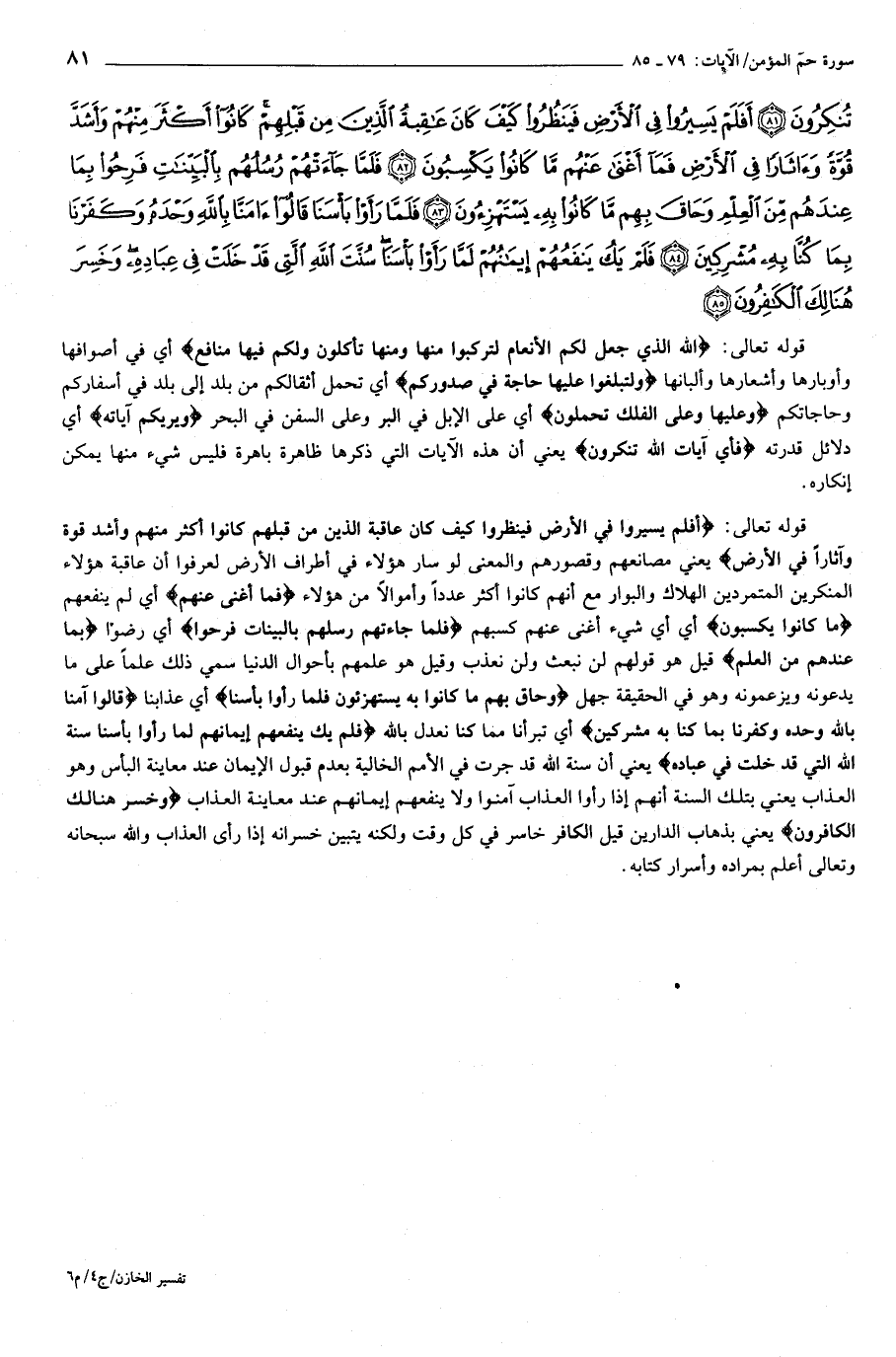 اللَّهُ الَّذِي جَعَلَ لَكُمُ الْأَنْعامَ لِتَرْكَبُوا مِنْها وَمِنْها تَأْكُلُونَ (79) وَلَكُمْ فِيها مَنافِعُ وَلِتَبْلُغُوا عَلَيْها حاجَةً فِي صُدُورِكُمْ وَعَلَيْها وَعَلَى الْفُلْكِ تُحْمَلُونَ (80) وَيُرِيكُمْ آياتِهِ فَأَيَّ آياتِ اللَّهِ تُنْكِرُونَ (81) أَفَلَمْ يَسِيرُوا فِي الْأَرْضِ فَيَنْظُرُوا كَيْفَ كانَ عاقِبَةُ الَّذِينَ مِنْ قَبْلِهِمْ كانُوا أَكْثَرَ مِنْهُمْ وَأَشَدَّ قُوَّةً وَآثاراً فِي الْأَرْضِ فَما أَغْنى عَنْهُمْ ما كانُوا يَكْسِبُونَ (82) فَلَمَّا جاءَتْهُمْ رُسُلُهُمْ بِالْبَيِّناتِ فَرِحُوا بِما عِنْدَهُمْ مِنَ الْعِلْمِ وَحاقَ بِهِمْ ما كانُوا بِهِ يَسْتَهْزِؤُنَ (83)