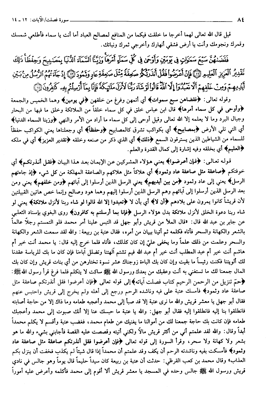 فَقَضاهُنَّ سَبْعَ سَماواتٍ فِي يَوْمَيْنِ وَأَوْحى فِي كُلِّ سَماءٍ أَمْرَها وَزَيَّنَّا السَّماءَ الدُّنْيا بِمَصابِيحَ وَحِفْظاً ذلِكَ تَقْدِيرُ الْعَزِيزِ الْعَلِيمِ (12) فَإِنْ أَعْرَضُوا فَقُلْ أَنْذَرْتُكُمْ صاعِقَةً مِثْلَ صاعِقَةِ عادٍ وَثَمُودَ (13) إِذْ جاءَتْهُمُ الرُّسُلُ مِنْ بَيْنِ أَيْدِيهِمْ وَمِنْ خَلْفِهِمْ أَلاَّ تَعْبُدُوا إِلاَّ اللَّهَ قالُوا لَوْ شاءَ رَبُّنا لَأَنْزَلَ مَلائِكَةً فَإِنَّا بِما أُرْسِلْتُمْ بِهِ كافِرُونَ (14)