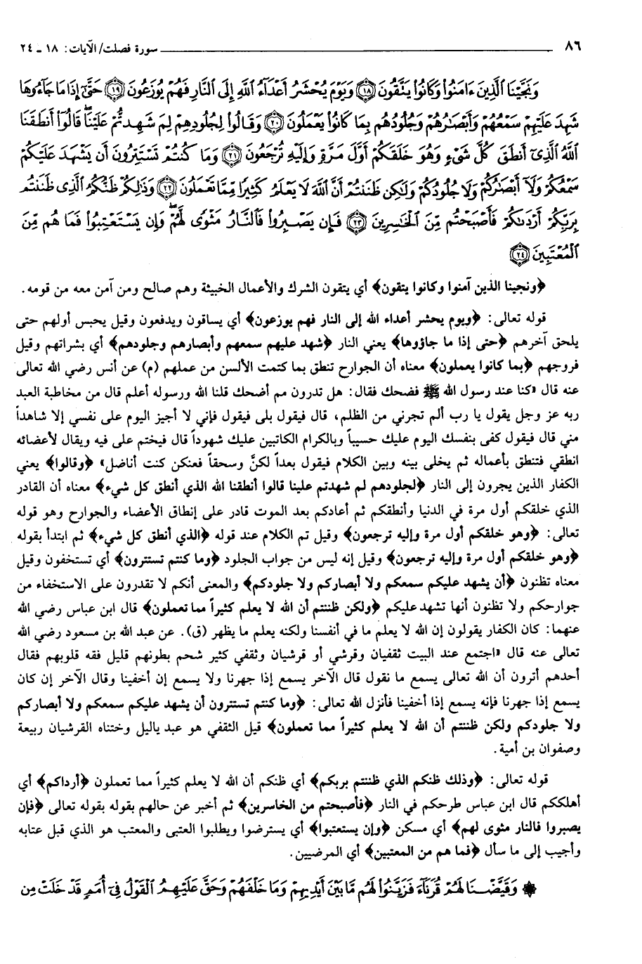 وَنَجَّيْنَا الَّذِينَ آمَنُوا وَكانُوا يَتَّقُونَ (18) وَيَوْمَ يُحْشَرُ أَعْداءُ اللَّهِ إِلَى النَّارِ فَهُمْ يُوزَعُونَ (19) حَتَّى إِذا ما جاؤُها شَهِدَ عَلَيْهِمْ سَمْعُهُمْ وَأَبْصارُهُمْ وَجُلُودُهُمْ بِما كانُوا يَعْمَلُونَ (20) وَقالُوا لِجُلُودِهِمْ لِمَ شَهِدْتُمْ عَلَيْنا قالُوا أَنْطَقَنَا اللَّهُ الَّذِي أَنْطَقَ كُلَّ شَيْءٍ وَهُوَ خَلَقَكُمْ أَوَّلَ مَرَّةٍ وَإِلَيْهِ تُرْجَعُونَ (21) وَما كُنْتُمْ تَسْتَتِرُونَ أَنْ يَشْهَدَ عَلَيْكُمْ سَمْعُكُمْ وَلا أَبْصارُكُمْ وَلا جُلُودُكُمْ وَلكِنْ ظَنَنْتُمْ أَنَّ اللَّهَ لا يَعْلَمُ كَثِيراً مِمَّا تَعْمَلُونَ (22)
