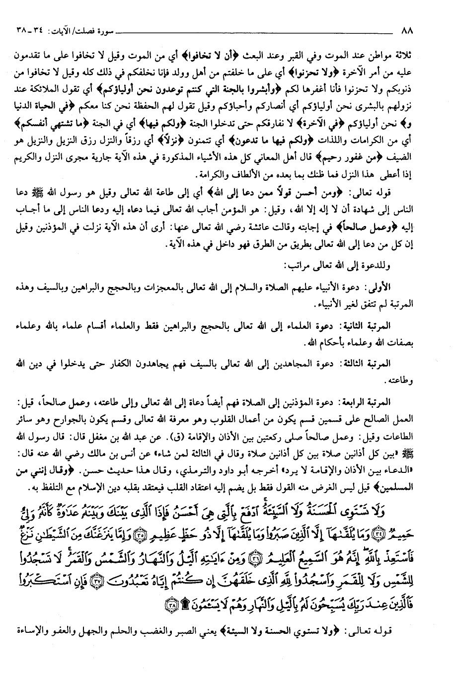 قوله تعالى: وَمَنْ أَحْسَنُ قَوْلًا مِمَّنْ دَعا إِلَى اللَّهِ أي إلى طاعة الله تعالى وقيل هو رسول الله صلّى الله عليه وسلّم دعا الناس إلى شهادة أن لا إله إلا الله، وقيل: هو المؤمن أجاب الله تعالى فيما دعاه إليه ودعا الناس إلى ما أجاب إليه وَعَمِلَ صالِحاً في إجابته وقالت عائشة رضي الله تعالى عنها: أرى أن هذه الآية نزلت في المؤذنين وقيل إن كل من دعا إلى الله تعالى بطريق من الطرق فهو داخل في هذه الآية.