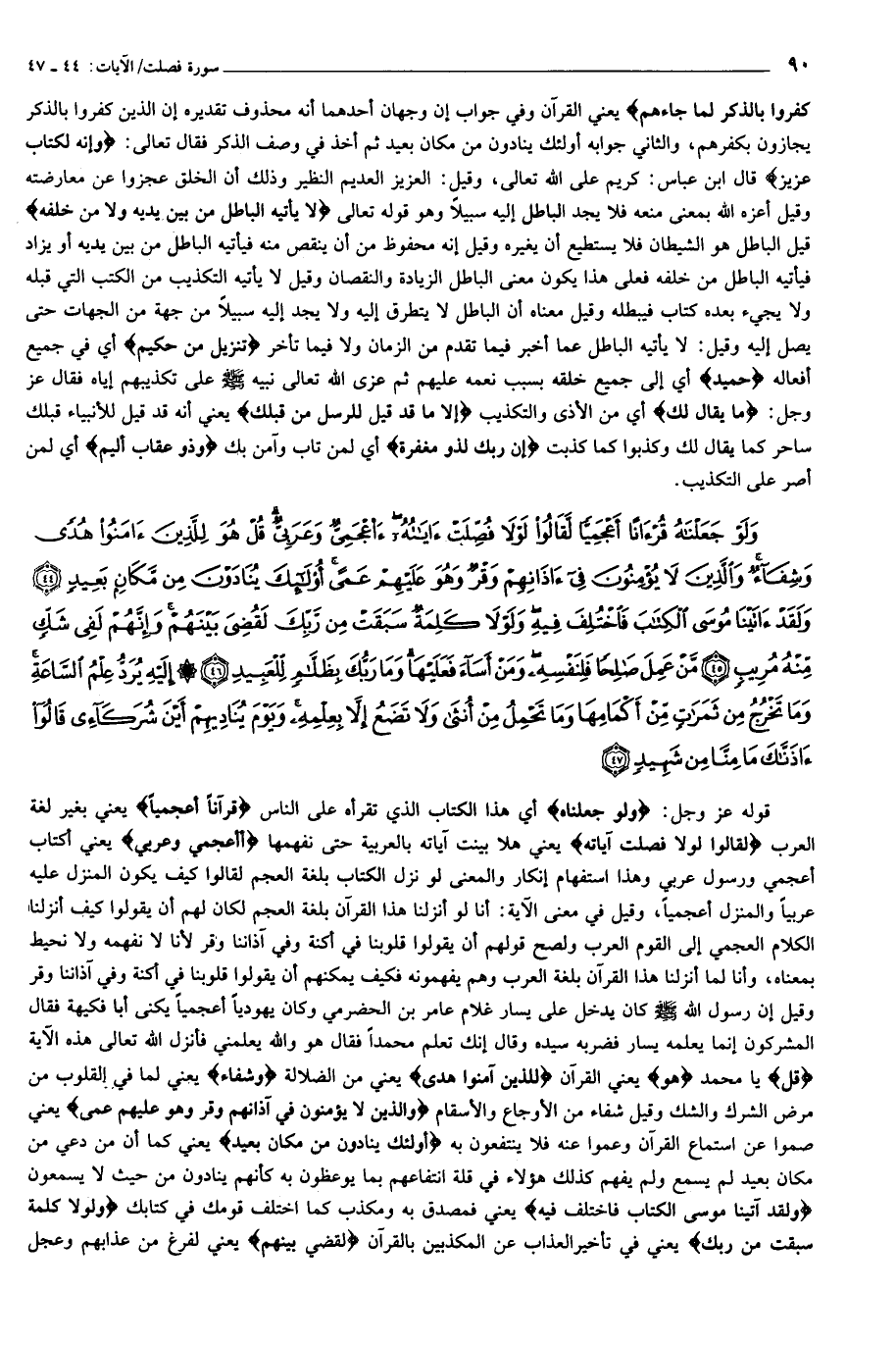 وَلَوْ جَعَلْناهُ قُرْآناً أَعْجَمِيًّا لَقالُوا لَوْلا فُصِّلَتْ آياتُهُءَ أَعْجَمِيٌّ وَعَرَبِيٌّ قُلْ هُوَ لِلَّذِينَ آمَنُوا هُدىً وَشِفاءٌ وَالَّذِينَ لا يُؤْمِنُونَ فِي آذانِهِمْ وَقْرٌ وَهُوَ عَلَيْهِمْ عَمًى أُولئِكَ يُنادَوْنَ مِنْ مَكانٍ بَعِيدٍ (44) وَلَقَدْ آتَيْنا مُوسَى الْكِتابَ فَاخْتُلِفَ فِيهِ وَلَوْلا كَلِمَةٌ سَبَقَتْ مِنْ رَبِّكَ لَقُضِيَ بَيْنَهُمْ وَإِنَّهُمْ لَفِي شَكٍّ مِنْهُ مُرِيبٍ (45) مَنْ عَمِلَ صالِحاً فَلِنَفْسِهِ وَمَنْ أَساءَ فَعَلَيْها وَما رَبُّكَ بِظَلاَّمٍ لِلْعَبِيدِ (46) إِلَيْهِ يُرَدُّ عِلْمُ السَّاعَةِ وَما تَخْرُجُ مِنْ ثَمَراتٍ مِنْ أَكْمامِها وَما تَحْمِلُ مِنْ أُنْثى وَلا تَضَعُ إِلاَّ بِعِلْمِهِ وَيَوْمَ يُنادِيهِمْ أَيْنَ شُرَكائِي قالُوا آذَنَّاكَ ما مِنَّا مِنْ شَهِيدٍ (47)