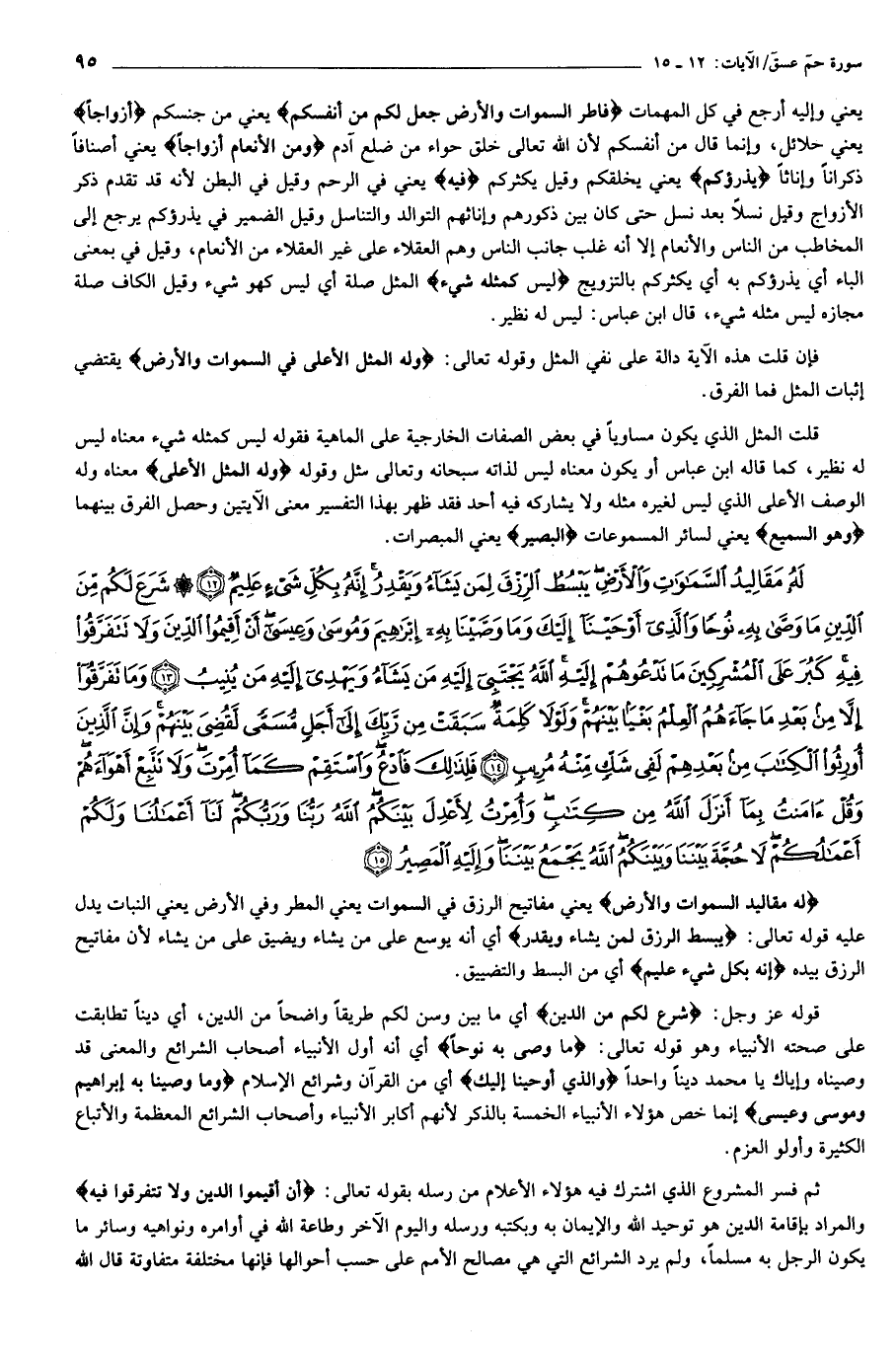 لَهُ مَقالِيدُ السَّماواتِ وَالْأَرْضِ يَبْسُطُ الرِّزْقَ لِمَنْ يَشاءُ وَيَقْدِرُ إِنَّهُ بِكُلِّ شَيْءٍ عَلِيمٌ (12) شَرَعَ لَكُمْ مِنَ الدِّينِ ما وَصَّى بِهِ نُوحاً وَالَّذِي أَوْحَيْنا إِلَيْكَ وَما وَصَّيْنا بِهِ إِبْراهِيمَ وَمُوسى وَعِيسى أَنْ أَقِيمُوا الدِّينَ وَلا تَتَفَرَّقُوا فِيهِ كَبُرَ عَلَى الْمُشْرِكِينَ ما تَدْعُوهُمْ إِلَيْهِ اللَّهُ يَجْتَبِي إِلَيْهِ مَنْ يَشاءُ وَيَهْدِي إِلَيْهِ مَنْ يُنِيبُ (13) وَما تَفَرَّقُوا إِلاَّ مِنْ بَعْدِ ما جاءَهُمُ الْعِلْمُ بَغْياً بَيْنَهُمْ وَلَوْلا كَلِمَةٌ سَبَقَتْ مِنْ رَبِّكَ إِلى أَجَلٍ مُسَمًّى لَقُضِيَ بَيْنَهُمْ وَإِنَّ الَّذِينَ أُورِثُوا الْكِتابَ مِنْ بَعْدِهِمْ لَفِي شَكٍّ مِنْهُ مُرِيبٍ (14) فَلِذلِكَ فَادْعُ وَاسْتَقِمْ كَما أُمِرْتَ وَلا تَتَّبِعْ أَهْواءَهُمْ وَقُلْ آمَنْتُ بِما أَنْزَلَ اللَّهُ مِنْ كِتابٍ وَأُمِرْتُ لِأَعْدِلَ بَيْنَكُمُ اللَّهُ رَبُّنا وَرَبُّكُمْ لَنا أَعْمالُنا وَلَكُمْ أَعْمالُكُمْ لا حُجَّةَ بَيْنَنا وَبَيْنَكُمُ اللَّهُ يَجْمَعُ بَيْنَنا وَإِلَيْهِ الْمَصِيرُ (15)