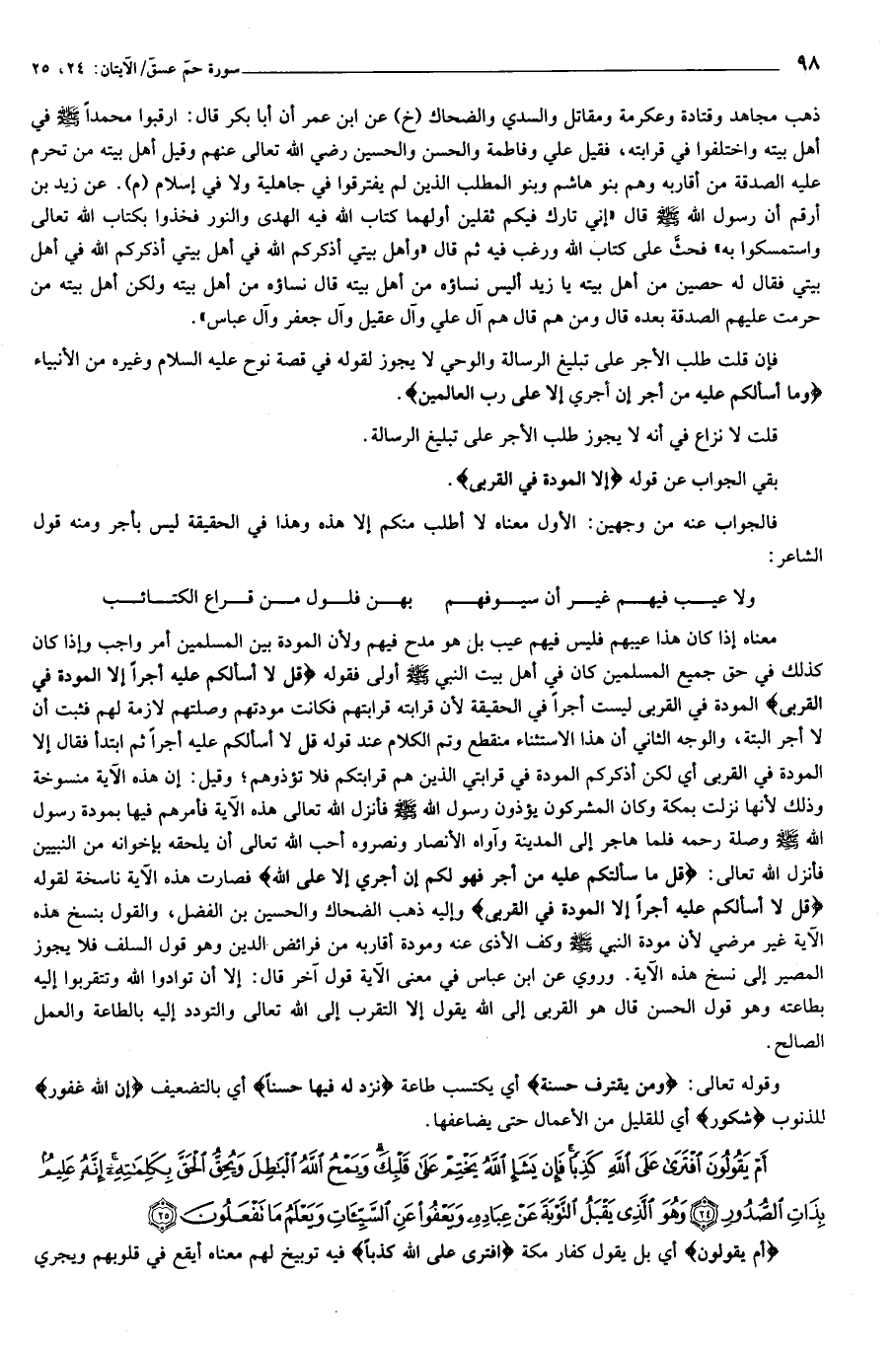 ذهب مجاهد وقتادة وعكرمة ومقاتل والسدي والضحاك (خ) عن ابن عمر أن أبا بكر قال: ارقبوا محمدا صلّى الله عليه وسلّم في أهل بيته واختلفوا في قرابته، فقيل علي وفاطمة والحسن والحسين رضي الله تعالى عنهم وقيل أهل بيته من تحرم عليه الصدقة من أقاربه وهم بنو هاشم وبنو المطلب الذين لم يفترقوا في جاهلية ولا في إسلام (م). عن زيد بن أرقم أن رسول الله صلّى الله عليه وسلّم قال «إني تارك فيكم ثقلين أولهما كتاب الله فيه الهدى والنور فخذوا بكتاب الله تعالى واستمسكوا به» فحثّ على كتاب الله ورغب فيه ثم قال «وأهل بيتي أذكركم الله في أهل بيتي أذكركم الله في أهل بيتي فقال له حصين من أهل بيته يا زيد أليس نساؤه من أهل بيته قال نساؤه من أهل بيته ولكن أهل بيته من حرمت عليهم الصدقة بعده قال ومن هم قال هم آل علي وآل عقيل وآل جعفر وآل عباس».