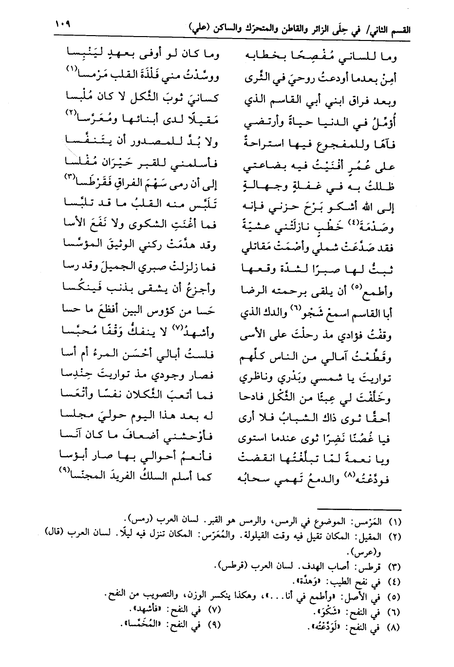 وقفت فؤادي مذ رحلت على الأسى ... وأشهد «7» لا ينفكّ وقفا محبّسا