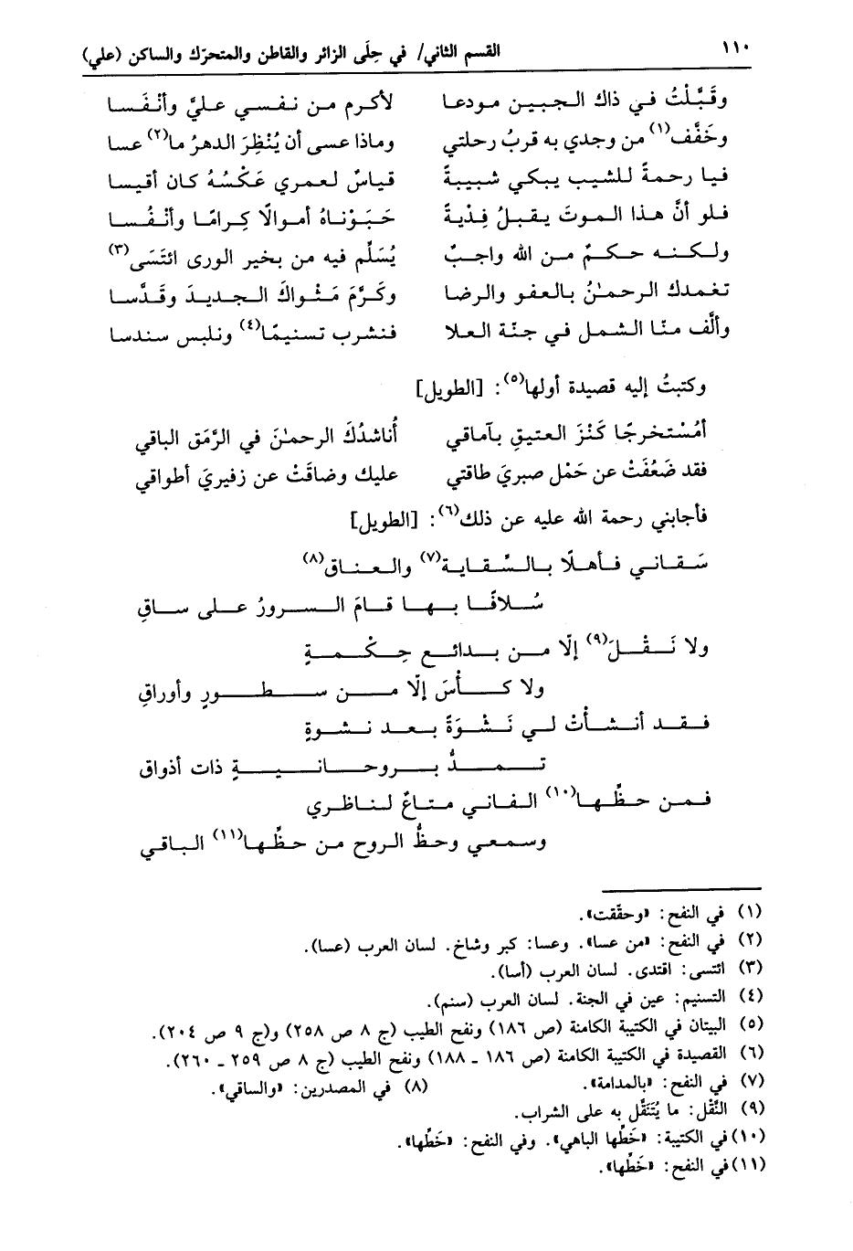 فمن حظّها «10» الفاني متاع لناظري ... وسمعي وحظّ الروح من حظّها «11» الباقي