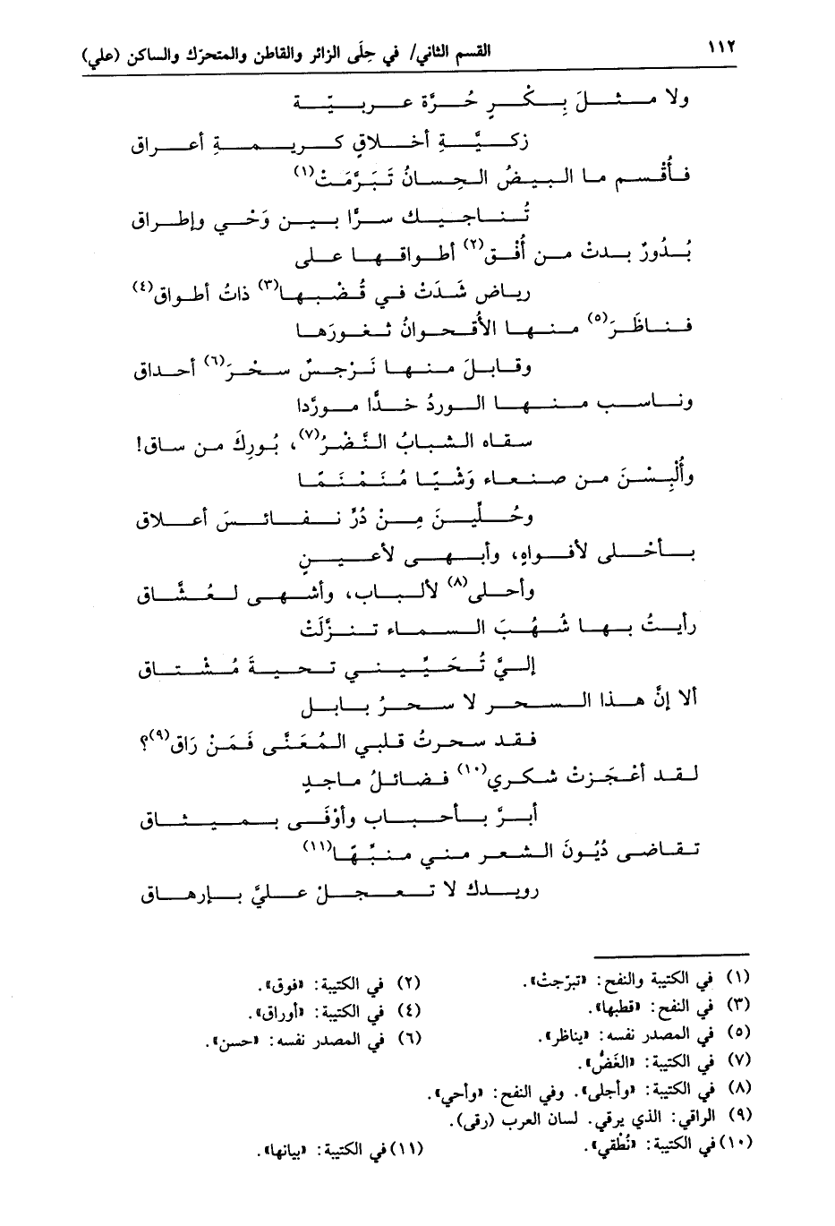 ألا إنّ هذا السحر لا سحر بابل ... فقد سحرت قلبي المعنّى فمن راق «9» ؟