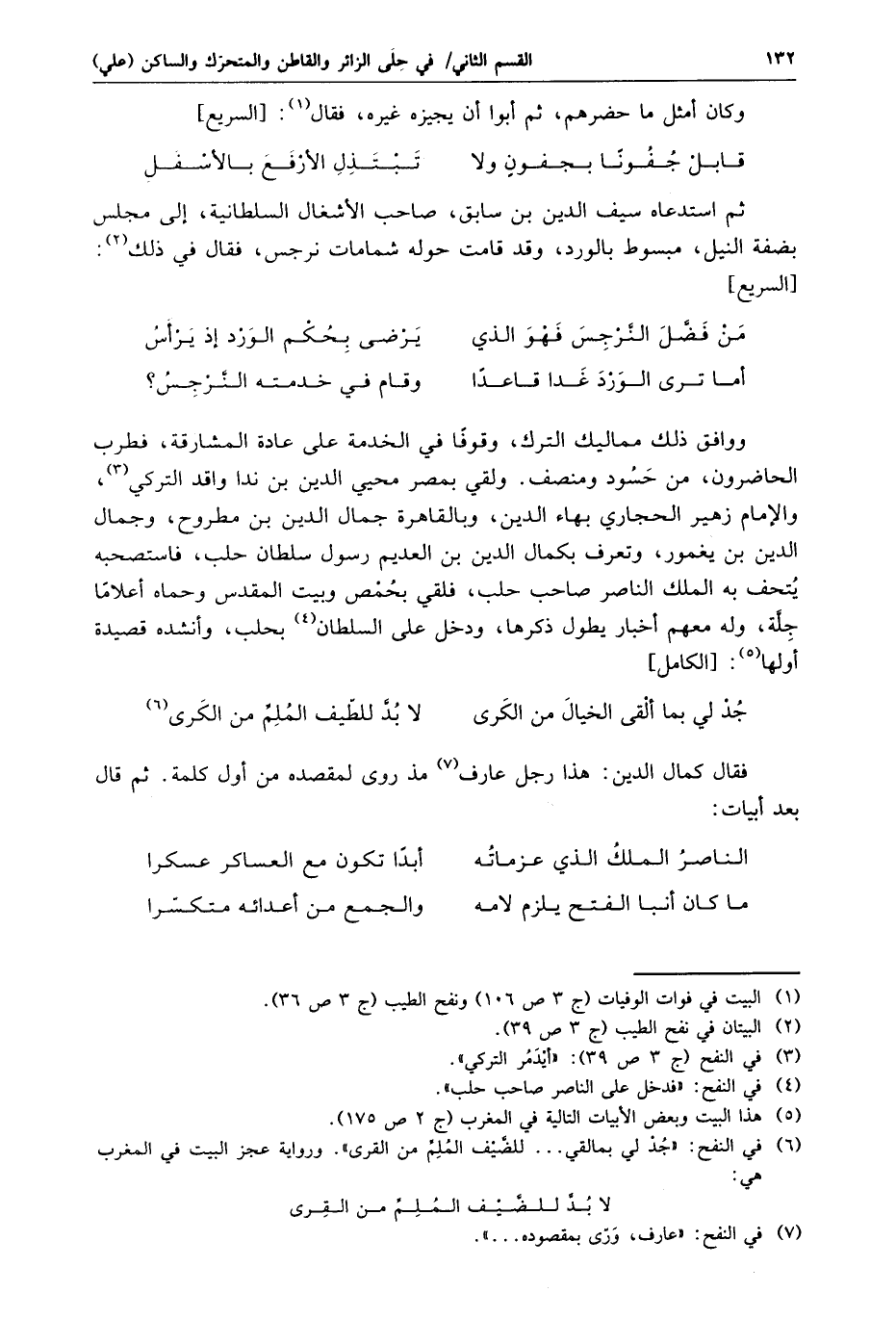 ووافق ذلك مماليك الترك، وقوفا في الخدمة على عادة المشارقة، فطرب الحاضرون، من حسود ومنصف. ولقي بمصر محيي الدين بن ندا واقد التركي «3» ، والإمام زهير الحجاري بهاء الدين، وبالقاهرة جمال الدين بن مطروح، وجمال الدين بن يغمور، وتعرف بكمال الدين بن العديم رسول سلطان حلب، فاستصحبه يتحف به الملك الناصر صاحب حلب، فلقي بحمص وبيت المقدس وحماه أعلاما جلّة، وله معهم أخبار يطول ذكرها، ودخل على السلطان «4» بحلب، وأنشده قصيدة أولها «5» : [الكامل]