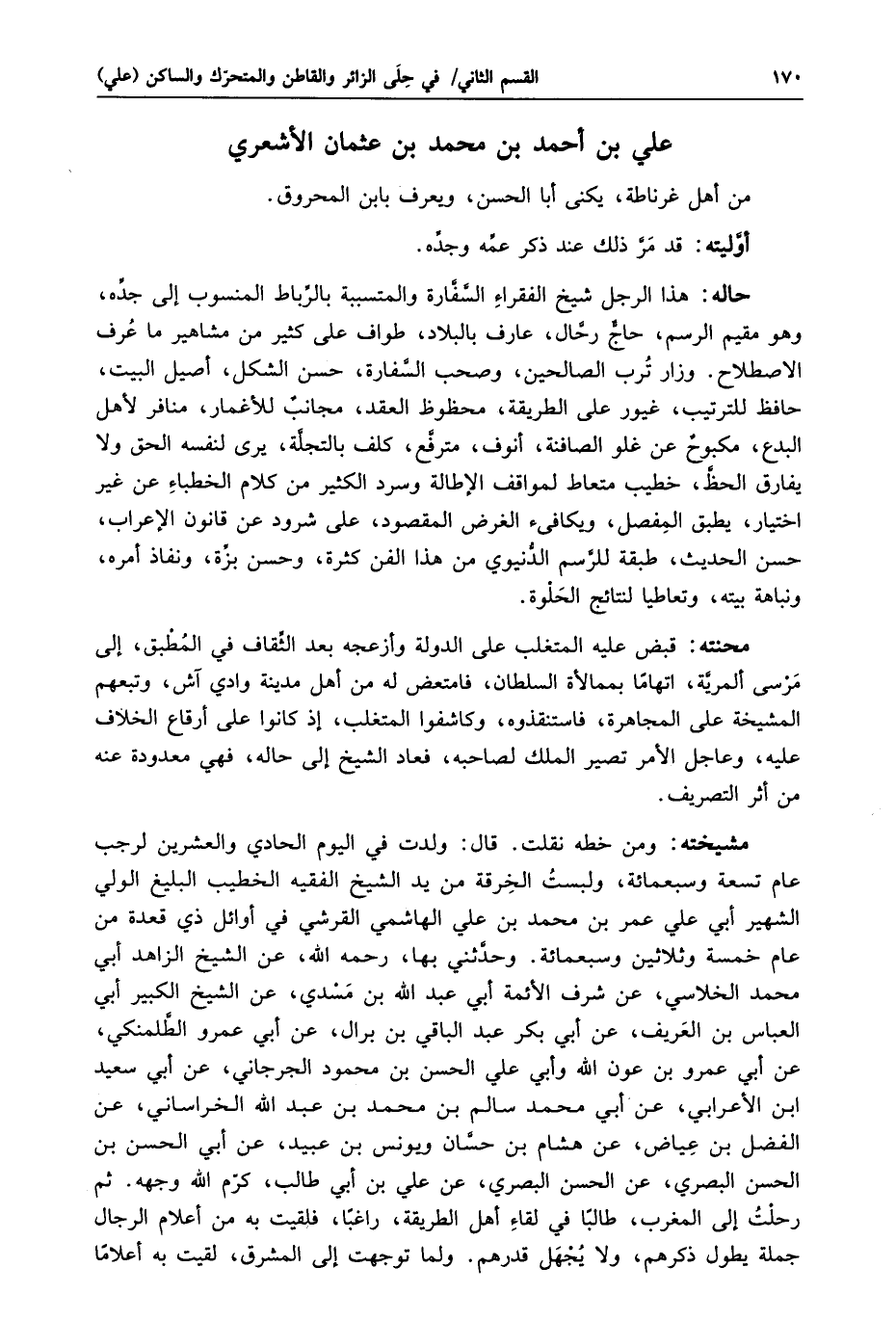 حاله: هذا الرجل شيخ الفقراء السّفّارة والمتسببة بالرّباط المنسوب إلى جدّه، وهو مقيم الرسم، حاجّ رحّال، عارف بالبلاد، طواف على كثير من مشاهير ما عرف الاصطلاح. وزار ترب الصالحين، وصحب السّفارة، حسن الشكل، أصيل البيت، حافظ للترتيب، غيور على الطريقة، محظوظ العقد، مجانب للأغمار، منافر لأهل البدع، مكبوح عن غلو الصافنة، أنوف، مترفّع، كلف بالتجلّة، يرى لنفسه الحق ولا يفارق الحظّ، خطيب متعاط لمواقف الإطالة وسرد الكثير من كلام الخطباء عن غير اختيار، يطبق المفصل، ويكافىء الغرض المقصود، على شرود عن قانون الإعراب، حسن الحديث، طبقة للرّسم الدّنيوي من هذا الفن كثرة، وحسن بزّة، ونفاذ أمره، ونباهة بيته، وتعاطيا لنتائج الحلوة.