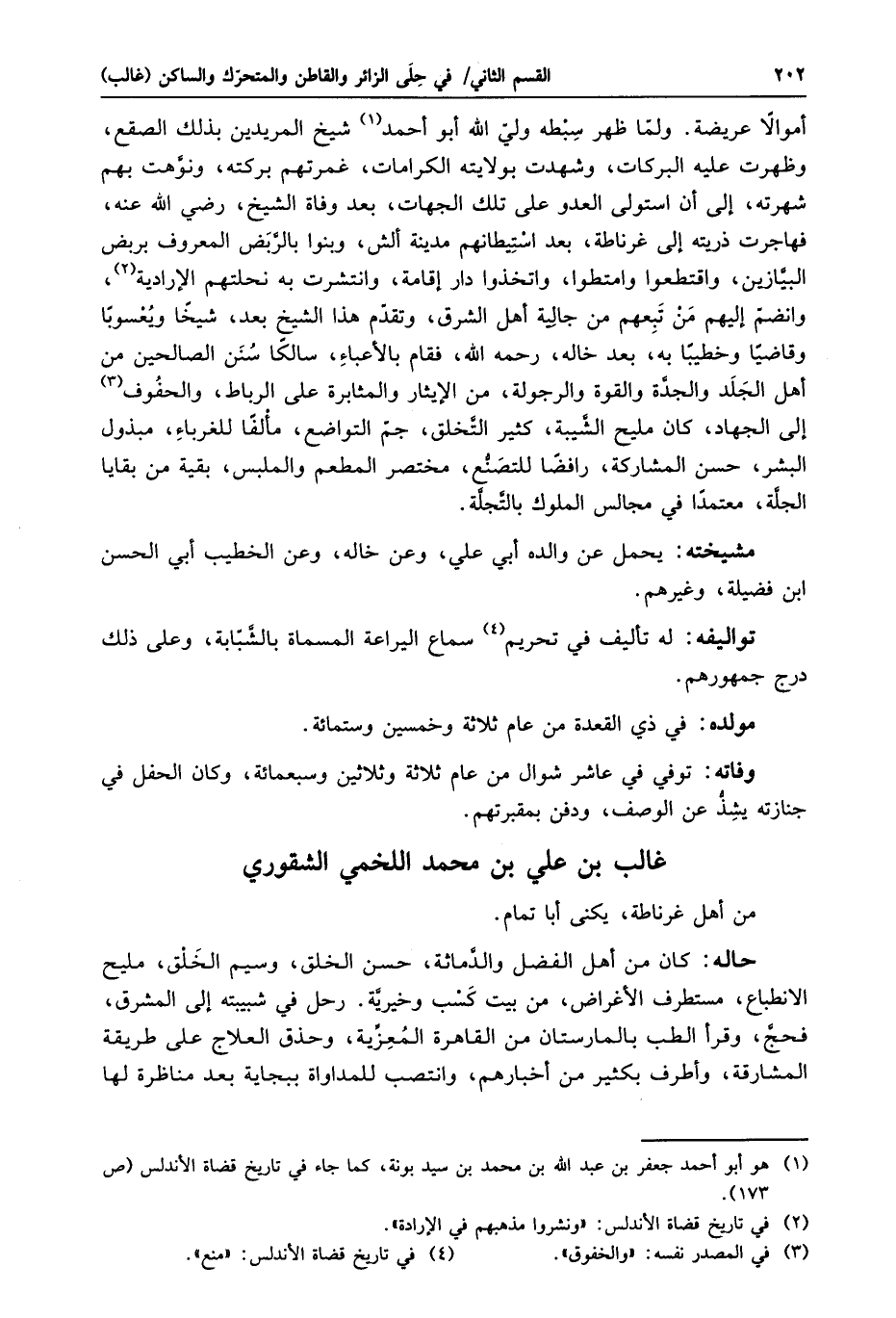 أموالا عريضة. ولمّا ظهر سبطه وليّ الله أبو أحمد «1» شيخ المريدين بذلك الصقع، وظهرت عليه البركات، وشهدت بولايته الكرامات، غمرتهم بركته، ونوّهت بهم شهرته، إلى أن استولى العدو على تلك الجهات، بعد وفاة الشيخ، رضي الله عنه، فهاجرت ذريته إلى غرناطة، بعد استيطانهم مدينة ألش، وبنوا بالرّبض المعروف بربض البيّازين، واقتطعوا وامتطوا، واتخذوا دار إقامة، وانتشرت به نحلتهم الإرادية «2» ، وانضمّ إليهم من تبعهم من جالية أهل الشرق، وتقدّم هذا الشيخ بعد، شيخا ويعسوبا وقاضيا وخطيبا به، بعد خاله، رحمه الله، فقام بالأعباء، سالكا سنن الصالحين من أهل الجلد والجدّة والقوة والرجولة، من الإيثار والمثابرة على الرباط، والحفوف «3» إلى الجهاد، كان مليح الشّيبة، كثير التّخلق، جمّ التواضع، مألفا للغرباء، مبذول البشر، حسن المشاركة، رافضا للتصنّع، مختصر المطعم والملبس، بقية من بقايا الجلّة، معتمدا في مجالس الملوك بالتّجلّة.