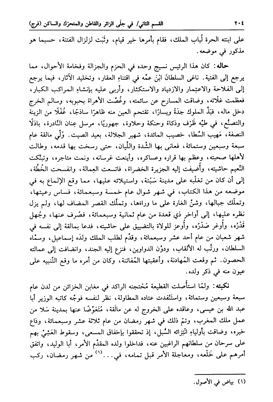 حاله: كان هذا الرئيس نسيج وحده في الحزم والجزالة وفخامة الأحوال، مما يرجع إلى الفتية. ناغى السلطان ابن عمّه في اقتناء العقار، وتخليد الآثار، فيما يرجع إلى الفلاحة والاعتمار والازدياد والاستكثار، وأربى عليه بإنشاء المراكب الكبار، فعظمت غلّاته، وضاقت المسارح عن سائمته، وغصّت الأهراء بحبوبه، وسالم الخرج دخل ماله، فبذّ الملوك جدة ويسارا، تقتحم العين منه ظاهرا ساذجا، غفلا من الزينة والتصنّع، في طيّه ظرف وذكاء وحنكة وحلاوة، جهوريا، مرسل عنان النّادرة، باذلا النصفة، مهيب السّطا، خصيب المائدة، شهير الجلالة، بعيد الصيت. ولّي مالقة عام سبعة وسبعين وستمائة، فعانى بها الشّدة واللّيان، حتى رسخت بها قدمه، وطالت لأهلها صحبته، وعظم بها قراره وعساكره، وأينعت غرسانه، ونمت متاجره، وتبنّكت النّعيم حاشيته، وأضيفت إليه الجزيرة الخضراء، فاتسعت العمالة، وانفسحت الخطّة، إلى أن كان من تغلّبه على مدينة سبتة، واستيلائه عليها، مما وقع الإلماع به في موضعه من هذا الكتاب، في شهر شوال عام خمسة وسبعمائة، فساس رعيتها، وتملّك جبالها، وشنّ الغارة على ما وراءها، وتملّك القصر المضاف لها، ولم يزل نظره عليها، إلى أواخر ذي قعدة من عام ثمانية وسبعمائة، فصرف عنها، وجهل قدره، وأوغر صدره، وأوعز للولاة بالتضييق على حاشيته، فدعا بمالقة إلى نفسه في شهر شعبان من عام أحد عشر وسبعمائة، وقدّم لطلب الملك ولده إسماعيل، وسمّاه السلطان، ورتّب له الألقاب، ودوّن الدواوين، فنزع إليه الجند، وانضافت إلى عمالته الحصون. ثم وقعت المهادنة، وأعقبتها المفاتنة، وكان من أمره ما وقع التّنبيه على عيون منه في ذكر ولده.