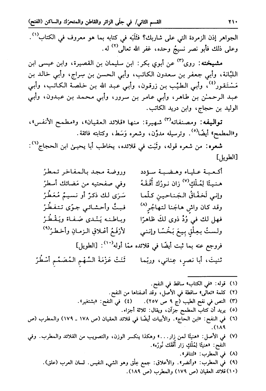 تواليفه: ومصنفاته «5» شهيرة: منها «قلائد العقيان» ، و «مطمح الأنفس» ، و «المطمح» أيضا «6» . وترسيله مدوّن، وشعره وسط، وكتابته فائقة.