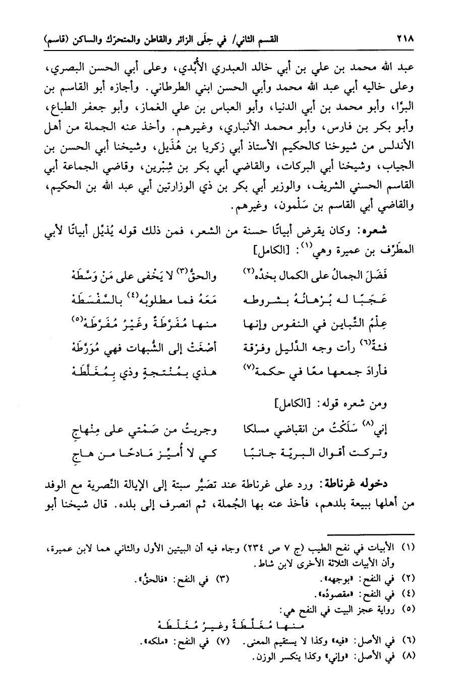 شعره: وكان يقرض أبياتا حسنة من الشعر، فمن ذلك قوله يذيّل أبياتا لأبي المطرّف بن عميرة وهي «1» : [الكامل]