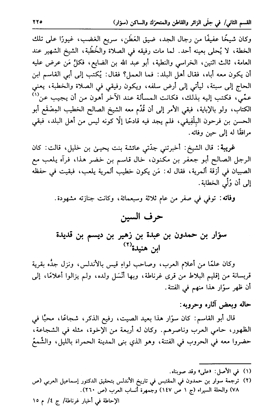 قال أبو القاسم: كان سوّار هذا بعيد الصيت، رفيع الذكر، شجاعا، محبّا في الظهور، حامي العرب وناصرهم. وكان له أربعة من الإخوة، مثله في الشجاعة، حضروا معه في الحروب في الفتنة، وهو الذي بنى المدينة الحمراء بالليل، والشّمع