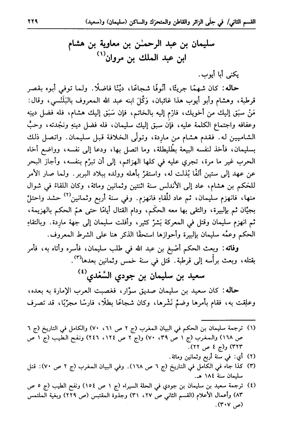 من سبق إليك من أخويك، فارم إليه بالخاتم، فإن سبق إليك هشام، فله فضل دينه وعفافه واجتماع الكلمة عليه، فإن سبق إليك سليمان، فله فضل دينه ونجدته، وحبّ الشاميين له. فقدم هشام من ماردة، وتولّى الخلافة قبل سليمان. واتصل ذلك بسليمان، فأخذ لنفسه البيعة بطليطلة، وما اتصل بها، ودعا إلى نفسه، وواضع أخاه الحرب غير ما مرة، تجري عليه في كلها الهزائم، إلى أن تبرّم بنفسه، وأجاز البحر عن عهد إلى ستين ألفا بذلت له، واستقرّ بأهله وولده ببلاد البربر. ولما صار الأمر للحكم بن هشام، عاد إلى الأندلس سنة اثنتين وثمانين ومائة، وكان اللقاء في شوال منها، فانهزم سليمان، ثم عاد للّقاء فانهزم. وفي سنة أربع وثمانين «2» حشد واحتلّ بجيّان ثم بإلبيرة، والتقى بها معه الحكم، ودام القتال أياما حتى همّ الحكم بالهزيمة، ثم انهزم سليمان وقتل في المعركة بشر كثير، وأفلت سليمان إلى جهة ماردة. وبالتقاء الحكم وعمّه سليمان بإلبيرة وأحوازها استحقّا الذكر هنا على الشرط المعروف.