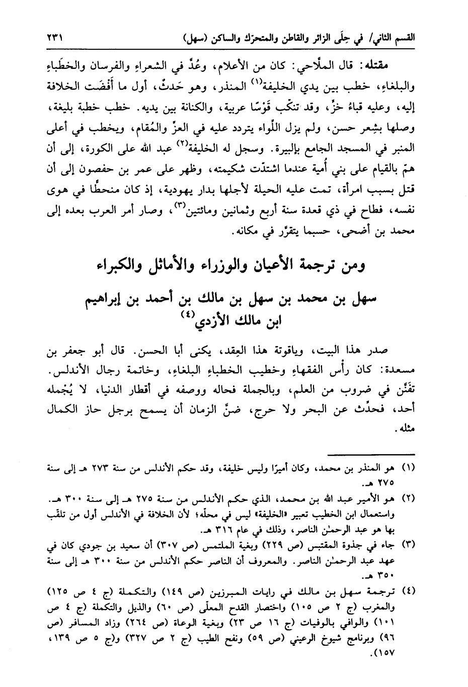 مقتله: قال الملّاحي: كان من الأعلام، وعدّ في الشعراء والفرسان والخطباء والبلغاء، خطب بين يدي الخليفة «1» المنذر، وهو حدث، أول ما أفضت الخلافة إليه، وعليه قباء خزّ، وقد تنكّب قوسا عربية، والكنانة بين يديه. خطب خطبة بليغة، وصلها بشعر حسن، ولم يزل اللّواء يتردد عليه في العزّ والمقام، ويخطب في أعلى المنبر في المسجد الجامع بإلبيرة. وسجل له الخليفة «2» عبد الله على الكورة، إلى أن همّ بالقيام على بني أمية عندما اشتدّت شكيمته، وظهر على عمر بن حفصون إلى أن قتل بسبب امرأة، تمت عليه الحيلة لأجلها بدار يهودية، إذ كان منحطّا في هوى نفسه، فطاح في ذي قعدة سنة أربع وثمانين ومائتين «3» ، وصار أمر العرب بعده إلى محمد بن أضحى، حسبما يتقرّر في مكانه.