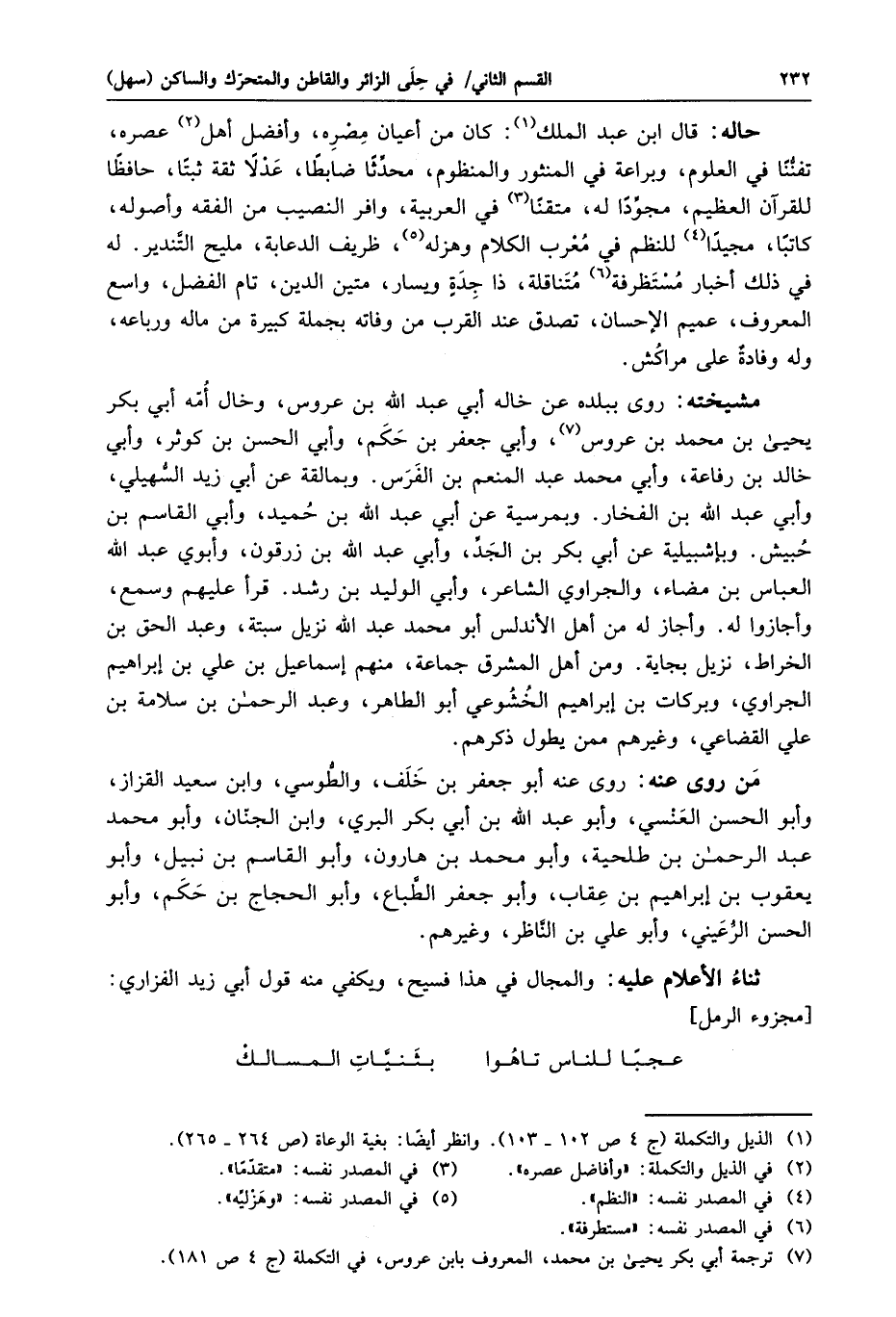 حاله: قال ابن عبد الملك «1» : كان من أعيان مصره، وأفضل أهل «2» عصره، تفنّنّا في العلوم، وبراعة في المنثور والمنظوم، محدّثا ضابطا، عدلا ثقة ثبتا، حافظا للقرآن العظيم، مجوّدا له، متقنا «3» في العربية، وافر النصيب من الفقه وأصوله، كاتبا، مجيدا «4» للنظم في معرب الكلام وهزله «5» ، ظريف الدعابة، مليح التّندير. له في ذلك أخبار مستظرفة «6» متناقلة، ذا جدة ويسار، متين الدين، تام الفضل، واسع المعروف، عميم الإحسان، تصدق عند القرب من وفاته بجملة كبيرة من ماله ورباعه، وله وفادة على مراكش.