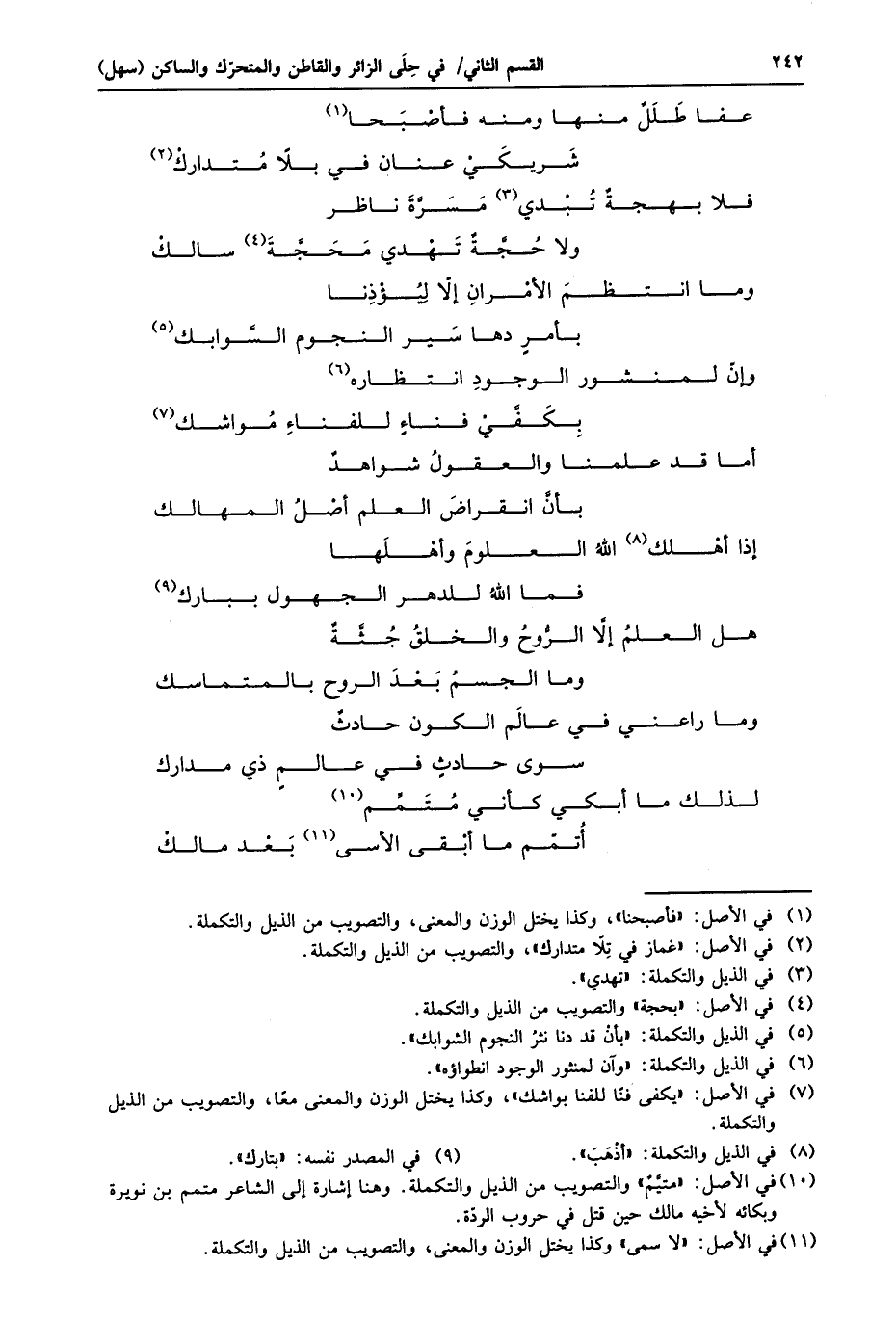 لذلك ما أبكي كأني متمّم «10» ... أتمّم ما أبقى الأسى «11» بعد مالك