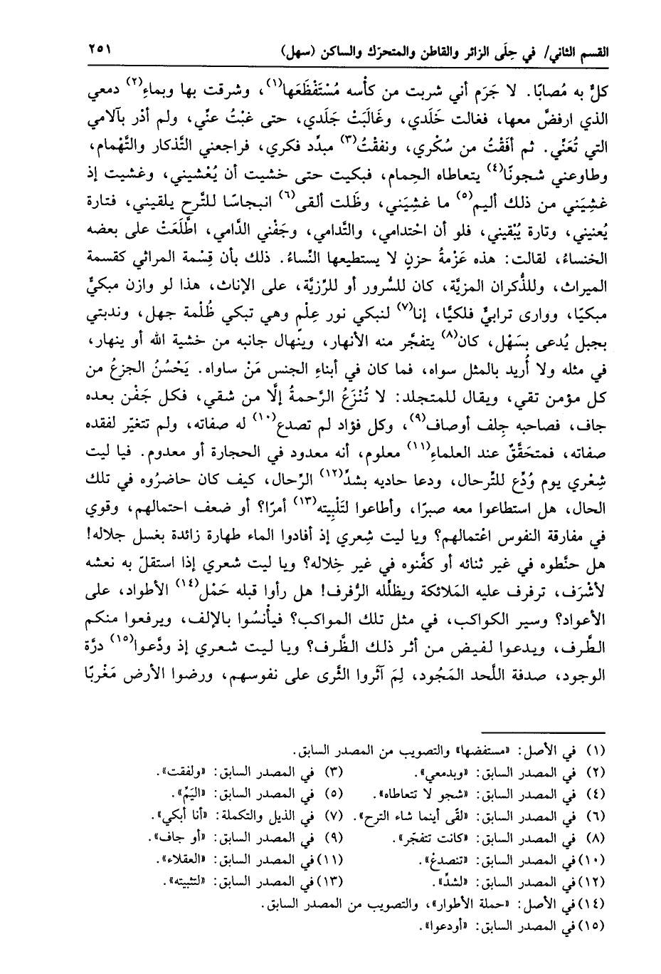 كلّ به مصابا. لا جرم أني شربت من كأسه مستفظعها «1» ، وشرقت بها وبماء «2» دمعي الذي ارفضّ معها، فغالت خلدي، وغالبت جلدي، حتى غبت عنّي، ولم أدر بآلامي التي تعنّي. ثم أفقت من سكري، ونفقت «3» مبدّد فكري، فراجعني التّذكار والتّهمام، وطاوعني شجونا «4» يتعاطاه الحمام، فبكيت حتى خشيت أن يعشيني، وغشيت إذ غشيني من ذلك أليم «5» ما غشيني، وظلت ألقى «6» انبجاسا للتّرح يلقيني، فتارة يعنيني، وتارة يبقيني، فلو أن احتدامي، والتّدامي، وجفني الدّامي، اطّلعت على بعضه الخنساء، لقالت: هذه عزمة حزن لا يستطيعها النّساء. ذلك بأن قسمة المراثي كقسمة الميراث، وللذّكران المزيّة، كان للسّرور أو للرّزيّة، على الإناث، هذا لو وازن مبكيّ مبكيا، ووارى ترابيّ فلكيّا، إنا «7» لنبكي نور علم وهي تبكي ظلمة جهل، وندبتي بجبل يدعى بسهل، كان «8» يتفجّر منه الأنهار، وينهال جانبه من خشية الله أو ينهار، في مثله ولا أريد بالمثل سواه، فما كان في أبناء الجنس من ساواه. يحسن الجزع من كل مؤمن تقي، ويقال للمتجلد: لا تنزع الرّحمة إلّا من شقي، فكل جفن بعده جاف، فصاحبه جلف أوصاف «9» ، وكل فؤاد لم تصدع «10» له صفاته، ولم تتغيّر لفقده صفاته، فمتحقّق عند العلماء «11» معلوم، أنه معدود في الحجارة أو معدوم. فيا ليت شعري يوم ودّع للتّرحال، ودعا حاديه بشدّ «12» الرّحال، كيف كان حاضروه في تلك الحال، هل استطاعوا معه صبرا، وأطاعوا لتلبيته «13» أمرا؟ أو ضعف احتمالهم، وقوي في مفارقة النفوس اعتمالهم؟ ويا ليت شعري إذ أفادوا الماء طهارة زائدة بغسل جلاله! هل حنّطوه في غير ثنائه أو كفّنوه في غير خلاله؟ ويا ليت شعري إذا استقلّ به نعشه لأشرف، ترفرف عليه الملائكة ويظلّله الرّفرف! هل رأوا قبله حمل «14» الأطواد، على الأعواد؟ وسير الكواكب، في مثل تلك المواكب؟ فيأنسوا بالإلف، ويرفعوا منكم الطّرف، ويدعوا لفيض من أثر ذلك الظّرف؟ ويا ليت شعري إذ ودّعوا «15» درّة الوجود، صدفة اللّحد المجود، لم آثروا الثّرى على نفوسهم، ورضوا الأرض مغربا