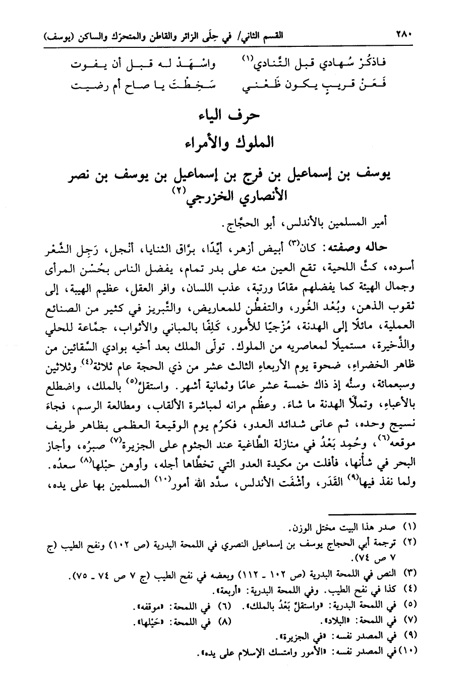 حاله وصفته: كان «3» أبيض أزهر، أيّدا، برّاق الثنايا، أنجل، رجل الشّعر أسوده، كثّ اللحية، تقع العين منه على بدر تمام، يفضل الناس بحسن المرأى وجمال الهيئة كما يفضلهم مقاما ورتبة، عذب اللسان، وافر العقل، عظيم الهيبة، إلى ثقوب الذهن، وبعد الغور، والتفطّن للمعاريض، والتّبريز في كثير من الصنائع العملية، مائلا إلى الهدنة، مزجيا للأمور، كلفا بالمباني والأثواب، جمّاعة للحلي والذّخيرة، مستميلا لمعاصريه من الملوك. تولّى الملك بعد أخيه بوادي السّقائين من ظاهر الخضراء، ضحوة يوم الأربعاء الثالث عشر من ذي الحجة عام ثلاثة «4» وثلاثين وسبعمائة، وسنّه إذ ذاك خمسة عشر عاما وثمانية أشهر. واستقلّ «5» بالملك، واضطلع بالأعباء، وتملّأ الهدنة ما شاء. وعظم مرانه لمباشرة الألقاب، ومطالعة الرسم، فجاء نسيج وحده، ثم عانى شدائد العدو، فكرم يوم الوقيعة العظمى بظاهر طريف موقعه «6» ، وحمد بعد في منازلة الطّاغية عند الجثوم على الجزيرة «7» صبره، وأجاز البحر في شأنها، فأفلت من مكيدة العدو التي تخطّاها أجله، وأوهن حبلها «8» سعده.