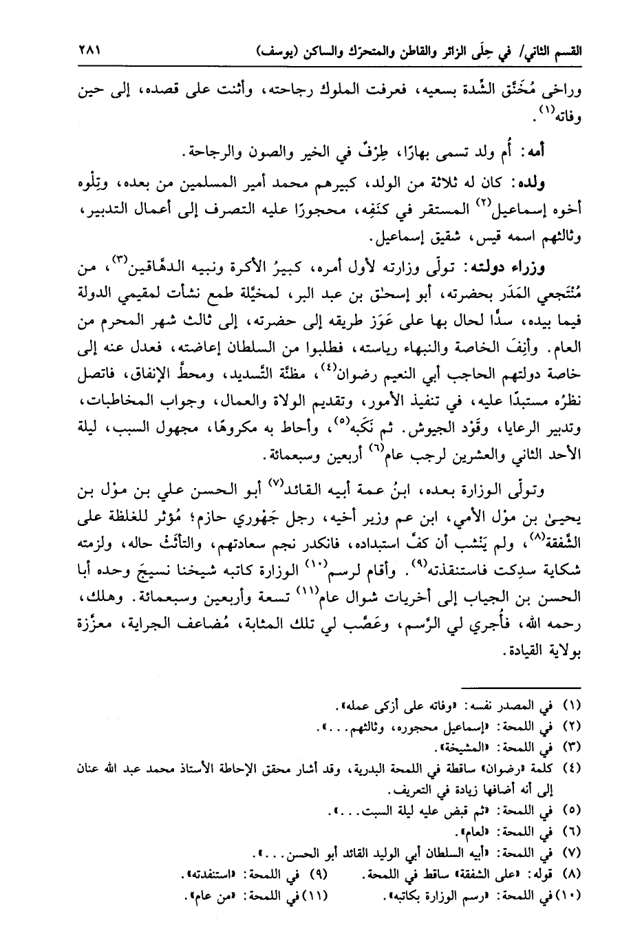 وتولّى الوزارة بعده، ابن عمة أبيه القائد «7» أبو الحسن علي بن مول بن يحيى بن مول الأمي، ابن عم وزير أخيه، رجل جهوري حازم؛ مؤثر للغلظة على الشّفقة «8» ، ولم ينشب أن كفّ استبداده، فانكدر نجم سعادتهم، والتأثث حاله، ولزمته شكاية سدكت فاستنقذته «9» . وأقام لرسم «10» الوزارة كاتبه شيخنا نسيج وحده أبا الحسن بن الجياب إلى أخريات شوال عام «11» تسعة وأربعين وسبعمائة. وهلك، رحمه الله، فأجري لي الرّسم، وعصّب لي تلك المثابة، مضاعف الجراية، معزّزة بولاية القيادة.
