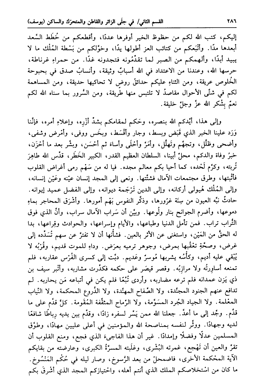 إليكم، كتب الله لكم من حظوظ الخير أوفرها عددا، وأقطعكم من خطط السّعد أبعدها مدا. وأتبعكم من كتائب العز أطولها يدا، وخوّلكم من بسطة الملك ما لا يبيد أبدا، وألهمكم من الصبر لما تقدّمونه فتجدونه غدا. من حمراء غرناطة، حرسها الله، وعندنا من الاعتداد في الله أسباب وثيقة، وأنساب صدق في بحبوحة الخلوص عريقة، ومن الثناء عليكم حدائق روض لا تحاكيها حديقة، ومن المساهمة لكم في شتّى الأحوال مقاصد لا تلتبس منها طريقة، ومن السّرور بما سناه الله لكم نعم بشكر الله عزّ وجلّ خليقة.