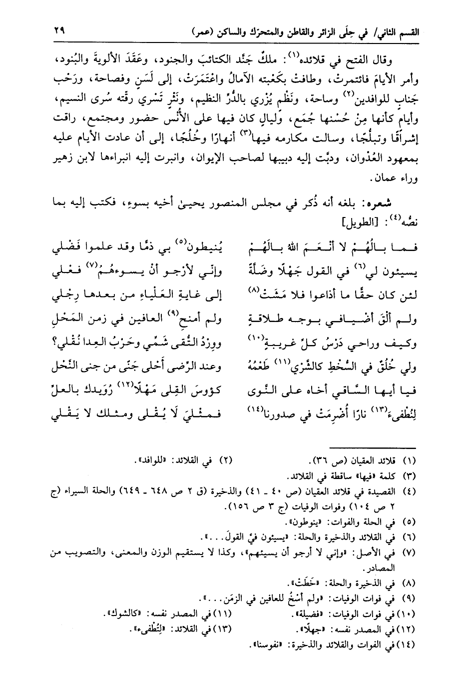 وقال الفتح في قلائده «1» : ملك جنّد الكتائب والجنود، وعقد الألوية والبنود، وأمر الأيام فائتمرت، وطافت بكعبته الآمال واعتمرت، إلى لسن وفصاحة، ورحب جناب للوافدين «2» وساحة، ونظم يزري بالدّرّ النظيم، ونثر تسري رقّته سرى النسيم، وأيام كأنها من حسنها جمع، وليال كان فيها على الأنس حضور ومجتمع، راقت إشراقا وتبلّجا، وسالت مكارمه فيها «3» أنهارا وخلجا، إلى أن عادت الأيام عليه بمعهود العدوان، ودبّت إليه دبيبها لصاحب الإيوان، وانبرت إليه انبراءها لابن زهير وراء عمان.