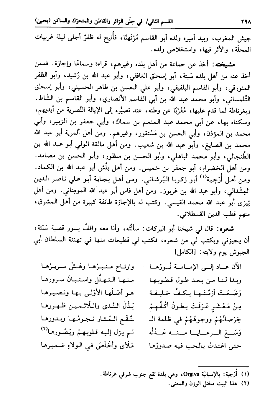 وبغرناطة لما قدم عليها، مغرّبا عن وطنه، عند تصيّره إلى الإيالة النّصرية من أيديهم، وسكناه بها، عن أبي محمد عبد المنعم بن سماك، وأبي جعفر بن الزبير، وأبي محمد بن المؤذن، وأبي الحسن بن مستقور، وغيرهم. ومن أهل ألمرية أبو عبد الله محمد بن الصايغ، وأبو عبد الله بن شعيب. ومن أهل مالقة الولي أبو عبد الله بن الطّنجالي، وأبو محمد الباهلي، وأبو الحسن بن منظور، وأبو الحسن بن مصامد.