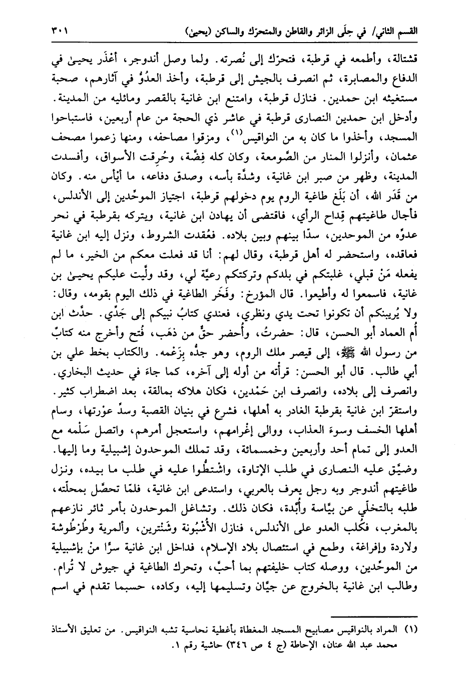 ، ومزقوا مصاحفه، ومنها زعموا مصحف عثمان، وأنزلوا المنار من الصّومعة، وكان كله فضّة، وحرقت الأسواق، وأفسدت المدينة، وظهر من صبر ابن غانية، وشدّة بأسه، وصدق دفاعه، ما أيأس منه. وكان من قدر الله، أن بلغ طاغية الروم يوم دخولهم قرطبة، اجتياز الموحّدين إلى الأندلس، فأجال طاغيتهم قداح الرأي، فاقتضى أن يهادن ابن غانية، ويتركه بقرطبة في نحر عدوّه من الموحدين، سدّا بينهم وبين بلاده. فعقدت الشروط، ونزل إليه ابن غانية فعاقده، واستحضر له أهل قرطبة، وقال لهم: أنا قد فعلت معكم من الخير، ما لم يفعله من قبلي، غلبتكم في بلدكم وتركتكم رعيّة لي، وقد ولّيت عليكم يحيى بن غانية، فاسمعوا له وأطيعوا. قال المؤرخ: وفخر الطاغية في ذلك اليوم بقومه، وقال: