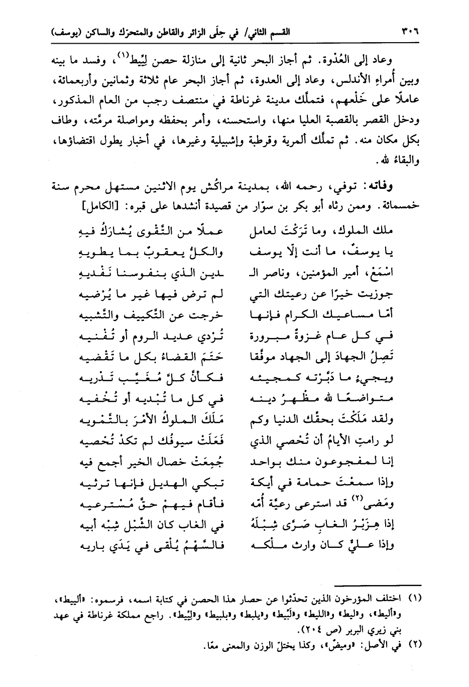 ، وفسد ما بينه وبين أمراء الأندلس، وعاد إلى العدوة، ثم أجاز البحر عام ثلاثة وثمانين وأربعمائة، عاملا على خلعهم، فتملّك مدينة غرناطة في منتصف رجب من العام المذكور، ودخل القصر بالقصبة العليا منها، واستحسنه، وأمر بحفظه ومواصلة مرمّته، وطاف بكل مكان منه. ثم تملّك ألمرية وقرطبة وإشبيلية وغيرها، في أخبار يطول اقتضاؤها، والبقاء لله.