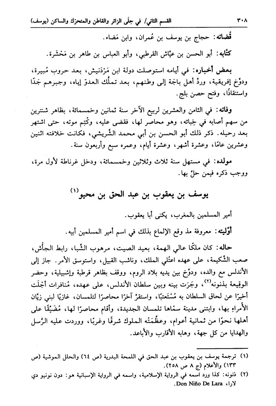 حاله: كان ملكا عالي الهمة، بعيد الصيت، مرهوب الشّبا، رابط الجأش، صعب الشّكيمة، على عهده اعتلي الملك، وناشب القبيل، واستوسق الأمر. جاز إلى الأندلس مع والده، ودوّخ بين يديه بلاد الروم، ووقف بظاهر قرطبة وإشبيلية، وحضر الوقيعة بذنونه «2» ، وجرت بينه وبين سلطان الأندلس، على عهده، منافرات أجلت أخيرا عن لحاق السلطان به مستعتبا، واستقرّ آخرا محاصرا لتلمسان، غازيا لبني زيّان الأمراء بها، وابتنى مدينة سمّاها تلمسان الجديدة، وأقام محاصرا لها، مضيّقا على أهلها نحوا من ثمانية أعوام، وعظّمته الملوك شرقا وغربا، ووردت عليه الرّسل والهدايا من كل جهة، وهابه الأقارب والأباعد.
