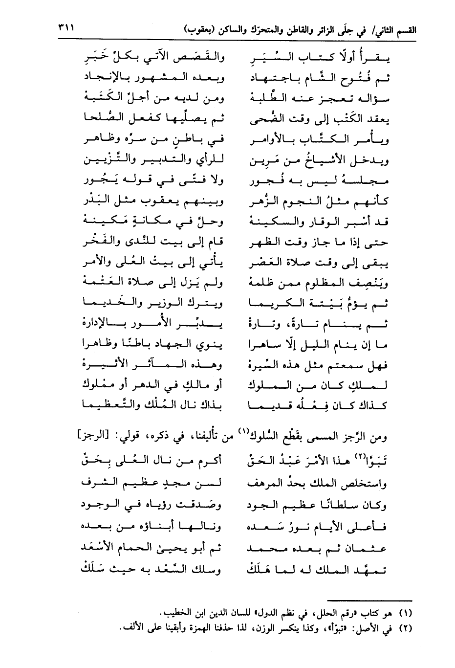 ومن الرّجز المسمى بقطع السّلوك «1» من تأليفنا، في ذكره، قولي: [الرجز]