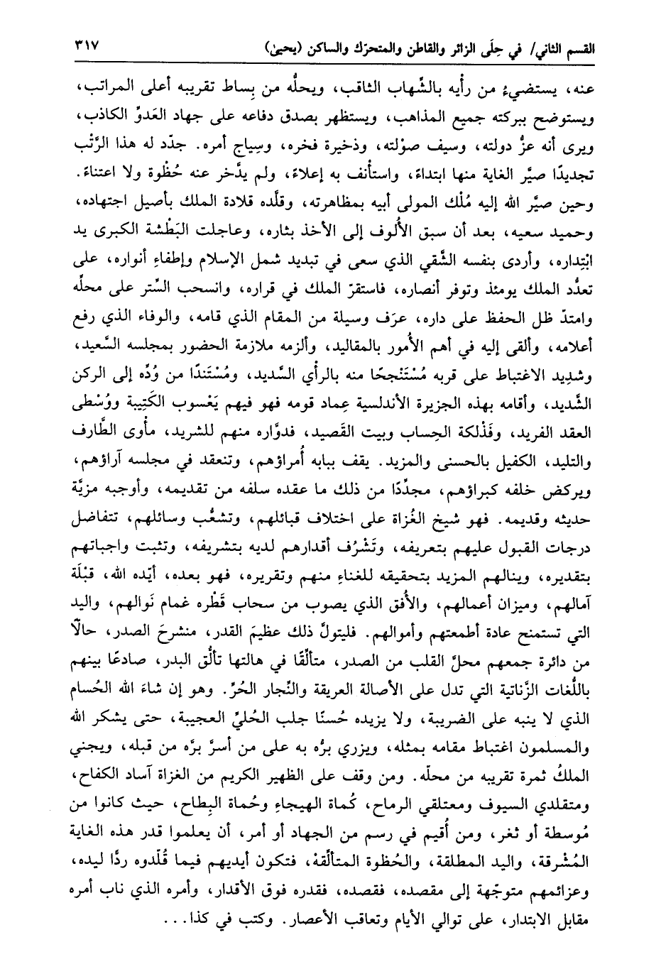 وحين صيّر الله إليه ملك المولى أبيه بمظاهرته، وقلّده قلادة الملك بأصيل اجتهاده، وحميد سعيه، بعد أن سبق الألوف إلى الأخذ بثاره، وعاجلت البطشة الكبرى يد ابتداره، وأردى بنفسه الشّقي الذي سعى في تبديد شمل الإسلام وإطفاء أنواره، على تعدّد الملك يومئذ وتوفر أنصاره، فاستقرّ الملك في قراره، وانسحب السّتر على محلّه وامتدّ ظل الحفظ على داره، عرف وسيلة من المقام الذي قامه، والوفاء الذي رفع أعلامه، وألقى إليه في أهم الأمور بالمقاليد، وألزمه ملازمة الحضور بمجلسه السّعيد، وشديد الاغتباط على قربه مستنجحا منه بالرأي السّديد، ومستندا من ودّه إلى الركن الشّديد، وأقامه بهذه الجزيرة الأندلسية عماد قومه فهو فيهم يعسوب الكتيبة ووسطى العقد الفريد، وفذلكة الحساب وبيت القصيد، فدوّاره منهم للشريد، مأوى الطّارف والتليد، الكفيل بالحسنى والمزيد. يقف ببابه أمراؤهم، وتنعقد في مجلسه آراؤهم، ويركض خلفه كبراؤهم، مجدّدا من ذلك ما عقده سلفه من تقديمه، وأوجبه مزيّة حديثه وقديمه. فهو شيخ الغزاة على اختلاف قبائلهم، وتشعّب وسائلهم، تتفاضل درجات القبول عليهم بتعريفه، وتشرف أقدارهم لديه بتشريفه، وتثبت واجباتهم بتقديره، وينالهم المزيد بتحقيقه للغناء منهم وتقريره، فهو بعده، أيّده الله، قبلة آمالهم، وميزان أعمالهم، والأفق الذي يصوب من سحاب قطره غمام نوالهم، واليد التي تستمنح عادة أطمعتهم وأموالهم. فليتولّ ذلك عظيم القدر، منشرح الصدر، حالّا من دائرة جمعهم محلّ القلب من الصدر، متألّقا في هالتها تألّق البدر، صادعا بينهم باللّغات الزّناتية التي تدل على الأصالة العريقة والنّجار الحرّ. وهو إن شاء الله الحسام الذي لا ينبه على الضريبة، ولا يزيده حسنا جلب الحليّ العجيبة، حتى يشكر الله والمسلمون اغتباط مقامه بمثله، ويزري برّه به على من أسرّ برّه من قبله، ويجني الملك ثمرة تقريبه من محلّه. ومن وقف على الظهير الكريم من الغزاة آساد الكفاح، ومتقلدي السيوف ومعتلقي الرماح، كماة الهيجاء وحماة البطاح، حيث كانوا من موسطة أو ثغر، ومن أقيم في رسم من الجهاد أو أمر، أن يعلموا قدر هذه الغاية المشرقة، واليد المطلقة، والحظوة المتألّقه، فتكون أيديهم فيما قلّدوه ردّا ليده، وعزائمهم متوجّهة إلى مقصده، فقصده، فقدره فوق الأقدار، وأمره الذي ناب أمره مقابل الابتدار، على توالي الأيام وتعاقب الأعصار. وكتب في كذا ...