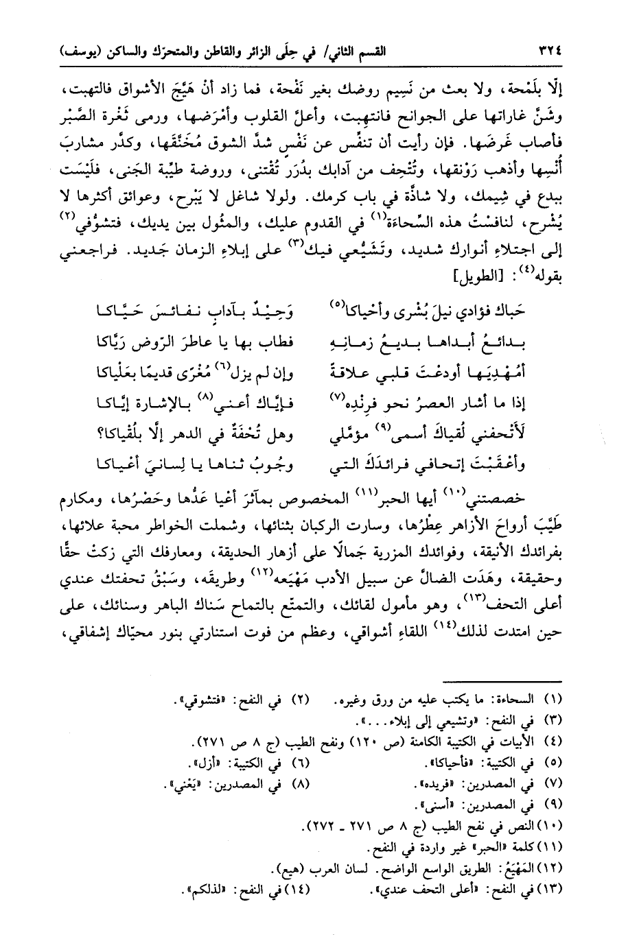 خصصتني «10» أيها الحبر «11» المخصوص بمآثر أعيا عدّها وحصرها، ومكارم طيّب أرواح الأزاهر عطرها، وسارت الركبان بثنائها، وشملت الخواطر محبة علائها، بفرائدك الأنيقة، وفوائدك المزرية جمالا على أزهار الحديقة، ومعارفك التي زكت حقّا وحقيقة، وهدت الضالّ عن سبيل الأدب مهيعه «12» وطريقه، وسبق تحفتك عندي أعلى التحف «13» ، وهو مأمول لقائك، والتمتّع بالتماح سناك الباهر وسنائك، على حين امتدت لذلك «14» اللقاء أشواقي، وعظم من فوت استنارتي بنور محيّاك إشفاقي،