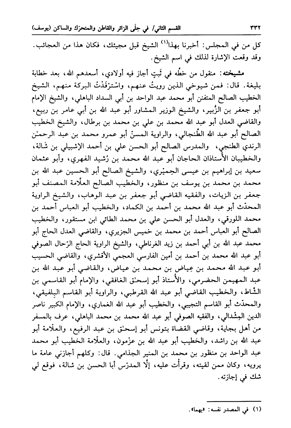 مشيخته: منقول من خطّه في ثبت أجاز فيه أولادي، أسعدهم الله، بعد خطابة بليغة. قال: فمن شيوخي الذين رويت عنهم، واسترفدت البركة منهم، الشيخ الخطيب الصالح المتفنن أبو محمد عبد الواحد بن أبي السداد الباهلي، والشيخ الإمام أبو جعفر بن الزّبير، والشيخ الوزير المشاور أبو عبد الله بن أبي عامر بن ربيع، والقاضي العدل أبو عبد الله محمد بن علي بن محمد بن برطال، والشيخ الخطيب الصالح أبو عبد الله الطّنجالي، والراوية المسنّ أبو عمرو محمد بن عبد الرحمن الرندي الطنجي، والمدرس الصالح أبو الحسن علي بن أحمد الإشبيلي بن شالة، والخطيبان الأستاذان الحاجان أبو عبد الله محمد بن رشيد الفهري، وأبو عثمان سعيد بن إبراهيم بن عيسى الحميري، والشيخ الصالح أبو الحسين عبد الله بن محمد بن محمد بن يوسف بن منظور، والخطيب الصالح العلّامة المصنف أبو جعفر بن الزيات، والفقيه القاضي أبو جعفر بن عبد الوهاب، والشيخ الراوية المحدّث أبو عبد الله محمد بن أحمد بن الكماد، والخطيب أبو العباس أحمد بن محمد اللورقي، والعدل أبو الحسن علي بن محمد الطائي ابن مستقور، والخطيب الصالح أبو العباس أحمد بن محمد بن خميس الجزيري، والقاضي العدل الحاج أبو محمد عبد الله بن أبي أحمد بن زيد الغرناطي، والشيخ الراوية الحاج الرّحال الصوفي أبو عبد الله محمد بن أحمد بن أمين الفارسي العجمي الأقشري، والقاضي الحسيب أبو عبد الله محمد بن عياض بن محمد بن عياض، والقاضي أبو عبد الله بن عبد المهيمن الحضرمي، والأستاذ أبو إسحاق الغافقي، والإمام أبو القاسمي بن الشّاط، والخطيب القاضي أبو عبد الله القرطبي، والراوية أبو القاسم البلفيقي، والمحدّث أبو القاسم التجيبي، والخطيب أبو عبد الله الغماري، والإمام الكبير ناصر الدين المشدالي، والفقيه الصوفي أبو عبد الله محمد بن محمد الباهلي، عرف بالمسفر من أهل بجاية، وقاضي القضاة بتونس أبو إسحاق بن عبد الرفيع، والعلّامة أبو عبد الله بن راشد، والخطيب أبو عبد الله بن عزمون، والعلّامة الخطيب أبو محمد عبد الواحد بن منظور بن محمد بن المنير الجذامي. قال: وكلهم أجازني عامة ما يرويه، وكان ممن لقيته، وقرأت عليه، إلّا المدرّس أبا الحسن بن شالة، فوقع لي شك في إجازته.