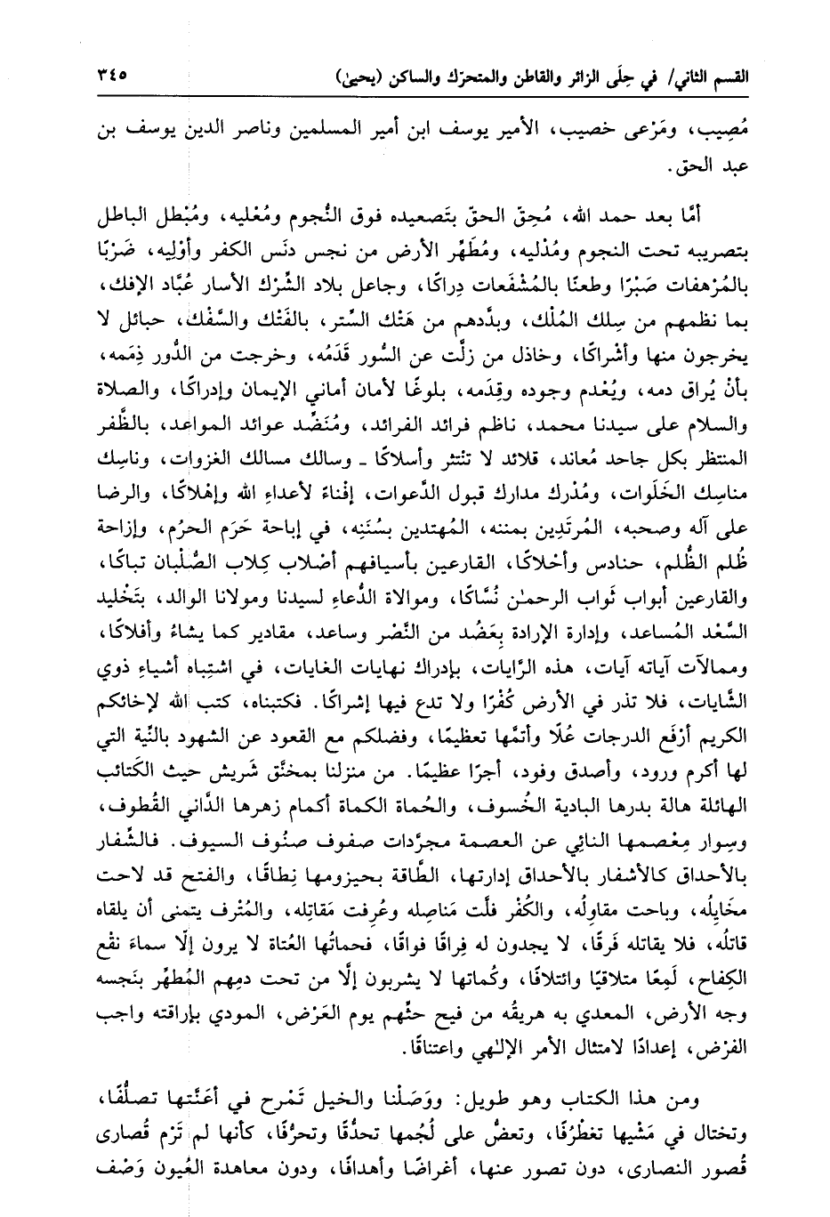 أمّا بعد حمد الله، محقّ الحقّ بتصعيده فوق النّجوم ومعليه، ومبطل الباطل بتصريبه تحت النجوم ومدليه، ومطهّر الأرض من نجس دنس الكفر وأوليه، ضربا بالمرهفات صبرا وطعنا بالمشفعات دراكا، وجاعل بلاد الشّرك الأسار عبّاد الإفك، بما نظمهم من سلك الملك، وبدّدهم من هتك السّتر، بالفتك والسّفك، حبائل لا يخرجون منها وأشراكا، وخاذل من زلّت عن السّور قدمه، وخرجت من الدّور ذممه، بأن يراق دمه، ويعدم وجوده وقدمه، بلوغا لأمان أماني الإيمان وإدراكا، والصلاة والسلام على سيدنا محمد، ناظم فرائد الفرائد، ومنضّد عوائد المواعد، بالظّفر المنتظر بكل جاحد معاند، قلائد لا تنتثر وأسلاكا- وسالك مسالك الغزوات، وناسك مناسك الخلوات، ومدرك مدارك قبول الدّعوات، إفناء لأعداء الله وإهلاكا، والرضا على آله وصحبه، المرتدين بمننه، المهتدين بسننه، في إباحة حرم الحرم، وإزاحة ظلم الظّلم، حنادس وأحلاكا، القارعين بأسيافهم أصلاب كلاب الصّلبان تباكا، والقارعين أبواب ثواب الرحمن نسّاكا، وموالاة الدّعاء لسيدنا ومولانا الوالد، بتخليد السّعد المساعد، وإدارة الإرادة بعضد من النّصر وساعد، مقادير كما يشاء وأفلاكا، وممالآت آياته آيات، هذه الرّايات، بإدراك نهايات الغايات، في اشتباه أشياء ذوي الشّايات، فلا تذر في الأرض كفرا ولا تدع فيها إشراكا. فكتبناه، كتب الله لإخائكم الكريم أرفع الدرجات علا وأتمّها تعظيما، وفضلكم مع القعود عن الشهود بالنّية التي لها أكرم ورود، وأصدق وفود، أجرا عظيما. من منزلنا بمخنّق شريش حيث الكتائب الهائلة هالة بدرها البادية الخسوف، والحماة الكماة أكمام زهرها الدّاني القطوف، وسوار معصمها النائي عن العصمة مجرّدات صفوف صنوف السيوف. فالشّفار بالأحداق كالأشفار بالأحداق إدارتها، الطّاقة بحيزومها نطاقا، والفتح قد لاحت مخايله، وباحت مقاوله، والكفر فلّت مناصله وعرفت مقاتله، والمترف يتمنى أن يلقاه قاتله، فلا يقاتله فرقا، لا يجدون له فراقا فواقا، فحماتها العتاة لا يرون إلّا سماء نقع الكفاح، لمعا متلاقيا وائتلافا، وكماتها لا يشربون إلّا من تحت دمهم المطهّر بنجسه وجه الأرض، المعدي به هريقه من فيح حثّهم يوم العرض، المودي بإراقته واجب الفرض، إعدادا لامتثال الأمر الإلهي واعتناقا.