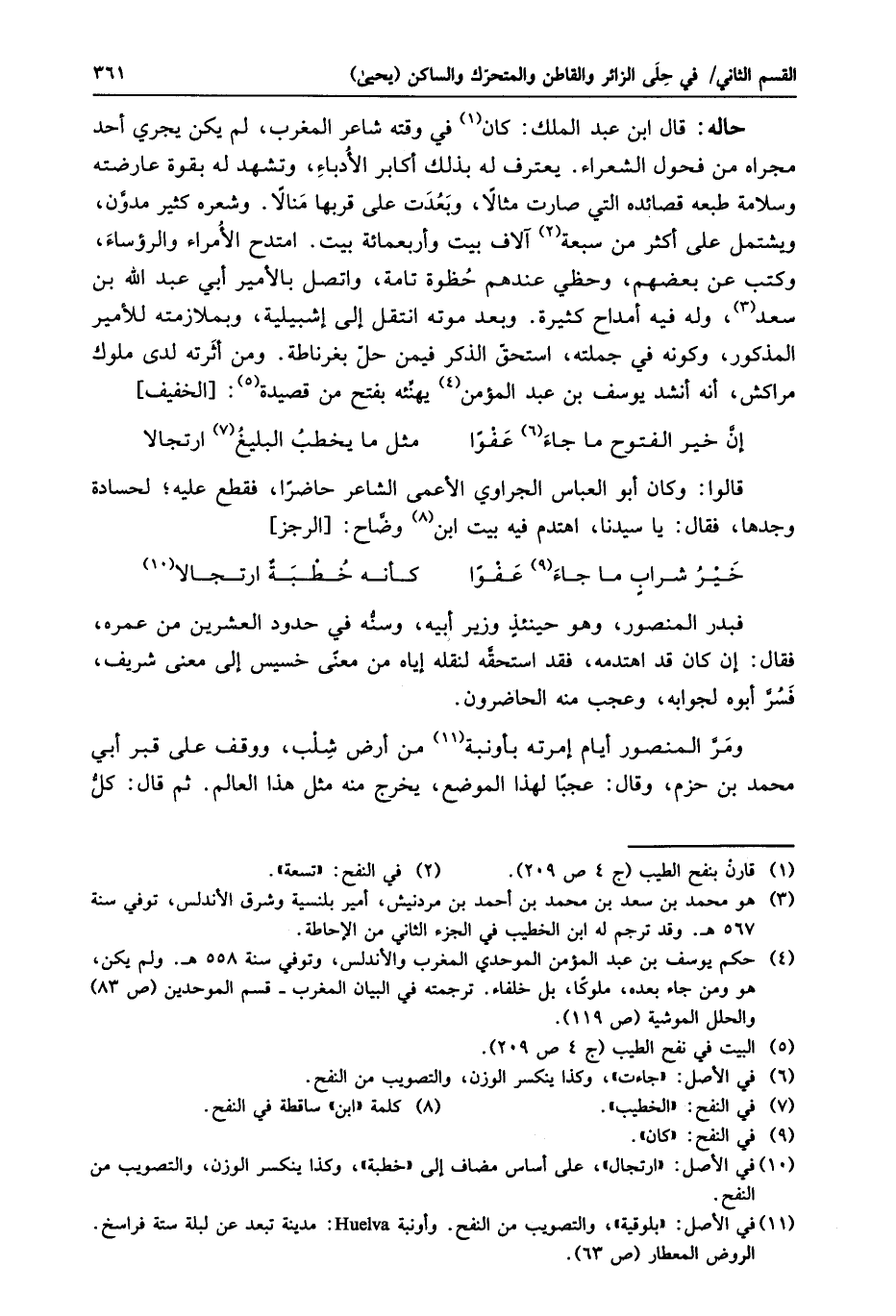 حاله: قال ابن عبد الملك: كان «1» في وقته شاعر المغرب، لم يكن يجري أحد مجراه من فحول الشعراء. يعترف له بذلك أكابر الأدباء، وتشهد له بقوة عارضته وسلامة طبعه قصائده التي صارت مثالا، وبعدت على قربها منالا. وشعره كثير مدوّن، ويشتمل على أكثر من سبعة «2» آلاف بيت وأربعمائة بيت. امتدح الأمراء والرؤساء، وكتب عن بعضهم، وحظي عندهم حظوة تامة، واتصل بالأمير أبي عبد الله بن سعد «3» ، وله فيه أمداح كثيرة. وبعد موته انتقل إلى إشبيلية، وبملازمته للأمير المذكور، وكونه في جملته، استحقّ الذكر فيمن حلّ بغرناطة. ومن أثرته لدى ملوك مراكش، أنه أنشد يوسف بن عبد المؤمن «4» يهنّئه بفتح من قصيدة «5» : [الخفيف]