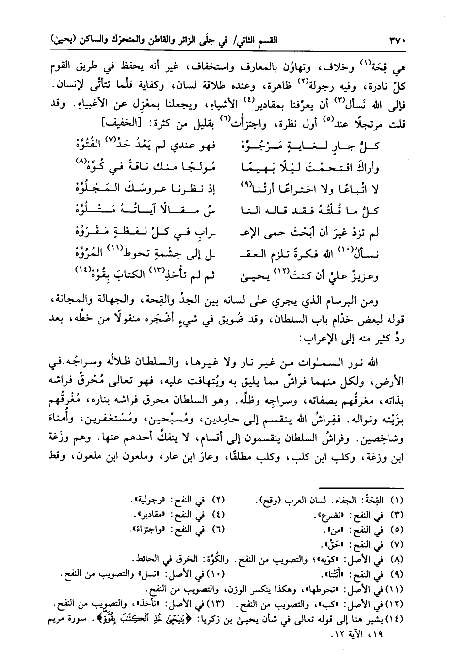 الله نور السماوات من غير نار ولا غيرها، والسلطان ظلاله وسراجه في الأرض، ولكل منهما فراش مما يليق به ويتهافت عليه، فهو تعالى محرق فراشه بذاته، مغرقهم بصفاته، وسراجه وظلّه. وهو السلطان محرق فراشه بناره، مغرقهم بزيته ونواله. ففراش الله ينقسم إلى حامدين، ومسبّحين، ومستغفرين، وأمناء وشاخصين. وفراش السلطان ينقسمون إلى أقسام، لا ينفكّ أحدهم عنها. وهم وزغة ابن وزغة، وكلب ابن كلب، وكلب مطلقا، وعار ابن عار، وملعون ابن ملعون، وقط