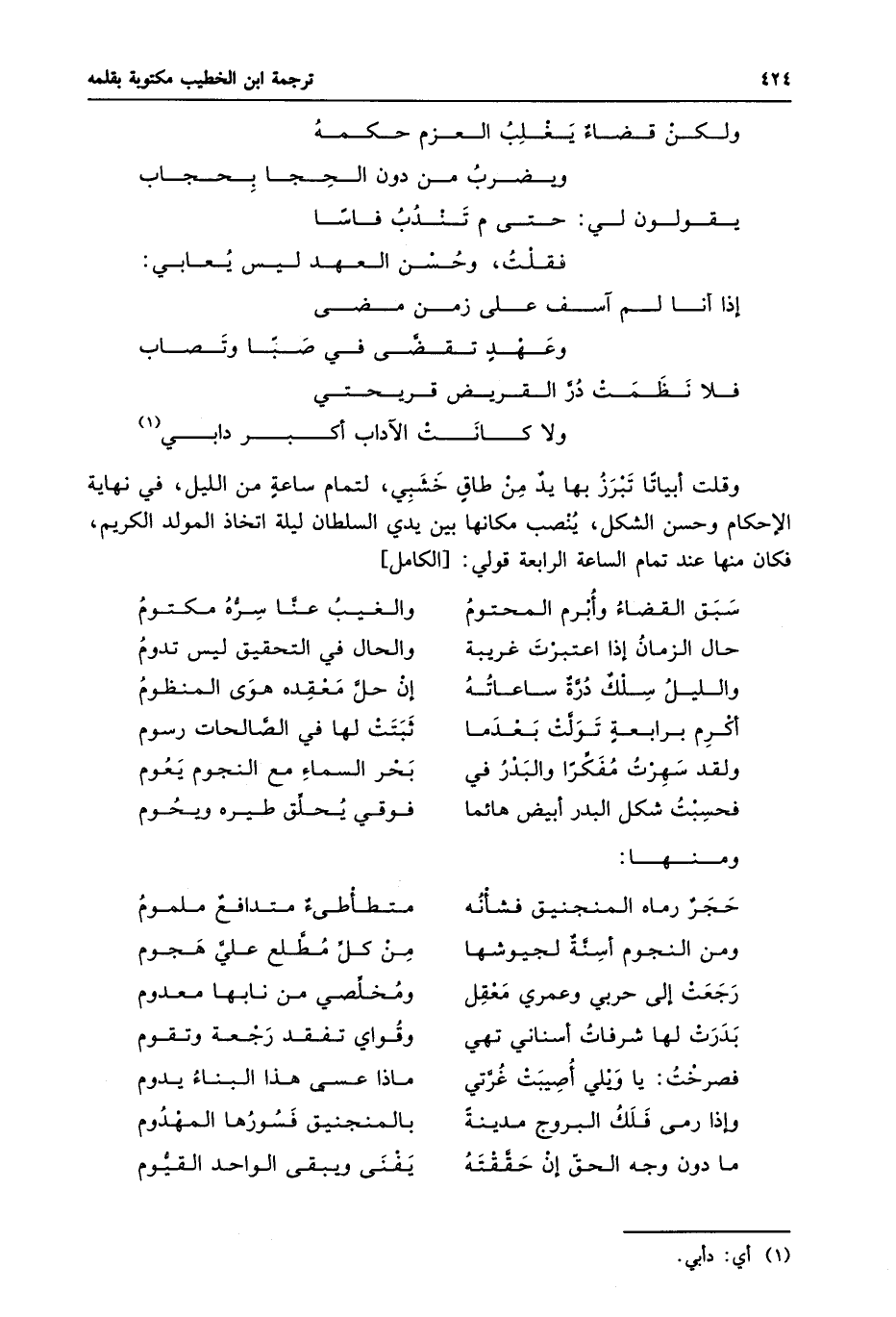 وقلت أبياتا تبرز بها يد من طاق خشبي، لتمام ساعة من الليل، في نهاية الإحكام وحسن الشكل، ينصب مكانها بين يدي السلطان ليلة اتخاذ المولد الكريم، فكان منها عند تمام الساعة الرابعة قولي: [الكامل]