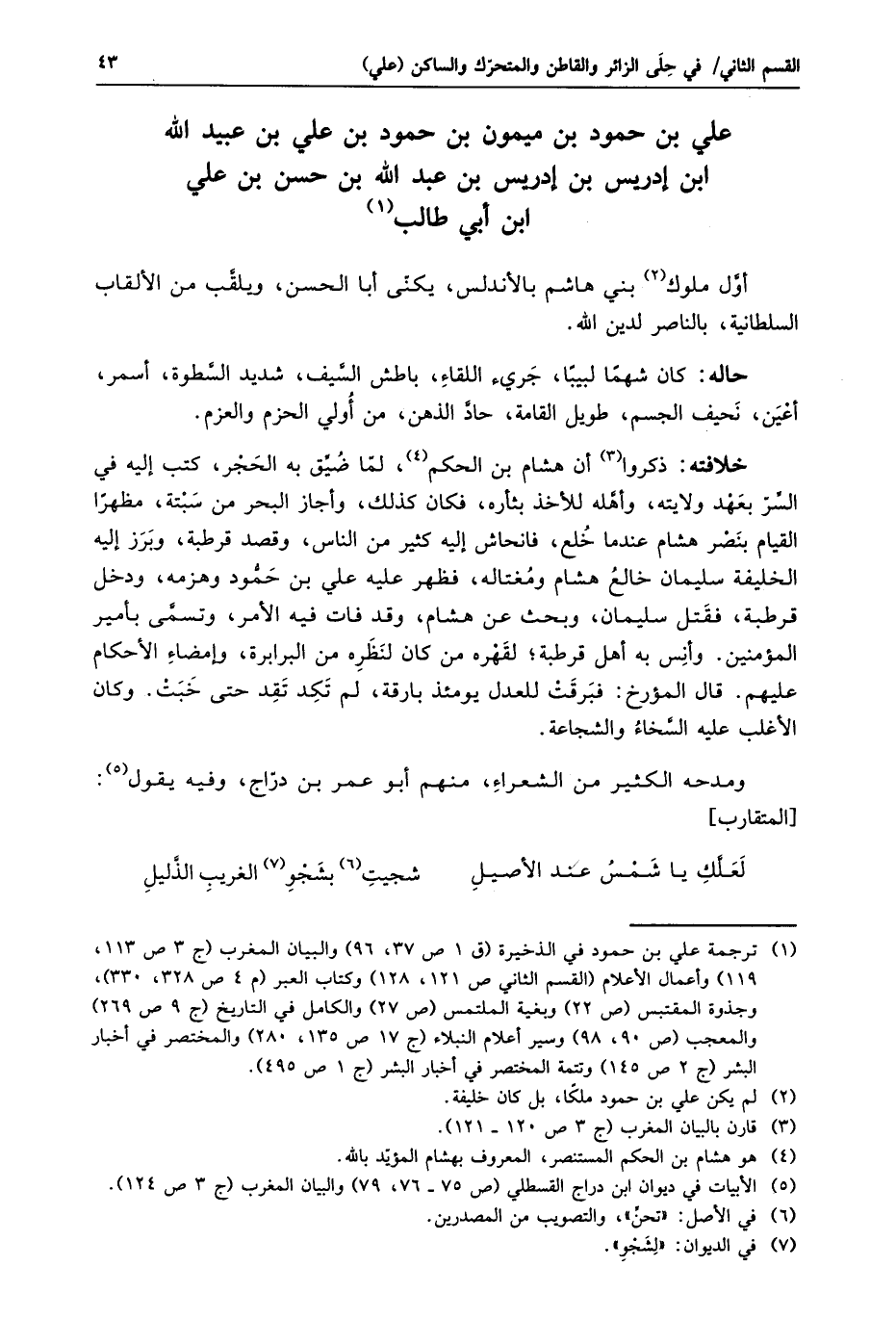 أوّل ملوك «2» بني هاشم بالأندلس، يكنّى أبا الحسن، ويلقّب من الألقاب السلطانية، بالناصر لدين الله.