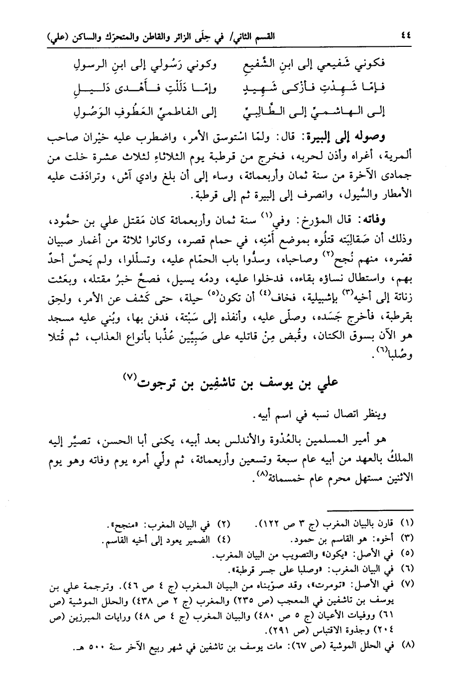 هو أمير المسلمين بالعدوة والأندلس بعد أبيه، يكنى أبا الحسن، تصيّر إليه الملك بالعهد من أبيه عام سبعة وتسعين وأربعمائة، ثم ولّي أمره يوم وفاته وهو يوم الاثنين مستهل محرم عام خمسمائة «8» .