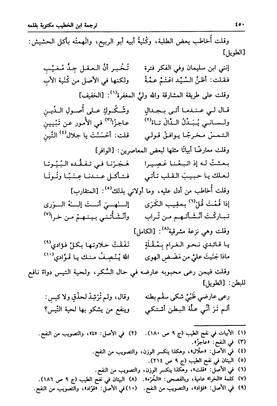 وقلت معارضا أبياتا مثلها لبعض المعاصرين: [الوافر]