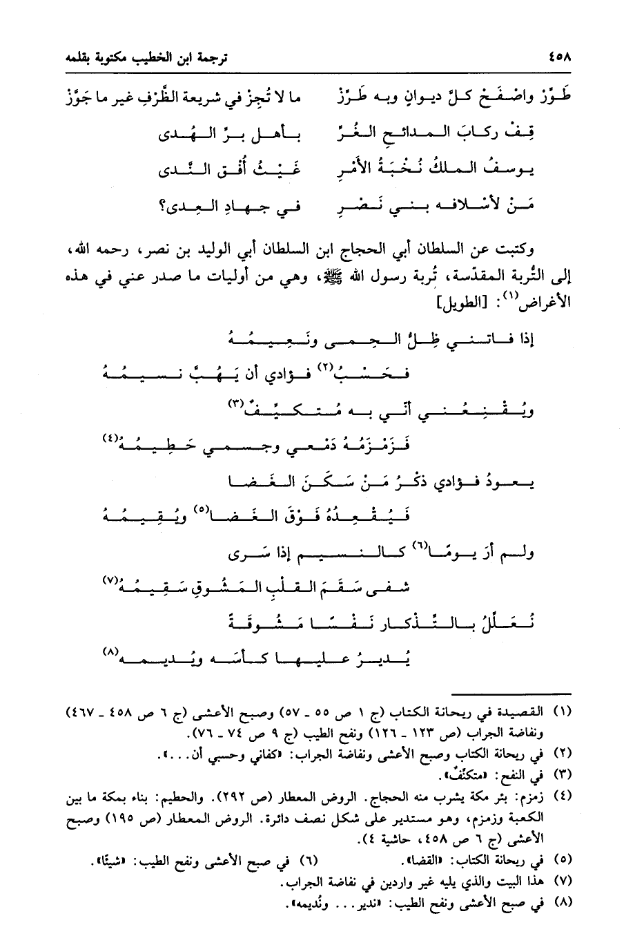 وكتبت عن السلطان أبي الحجاج ابن السلطان أبي الوليد بن نصر، رحمه الله، إلى التّربة المقدّسة، تربة رسول الله صلى الله عليه وسلم، وهي من أوليات ما صدر عني في هذه الأغراض «1» : [الطويل]