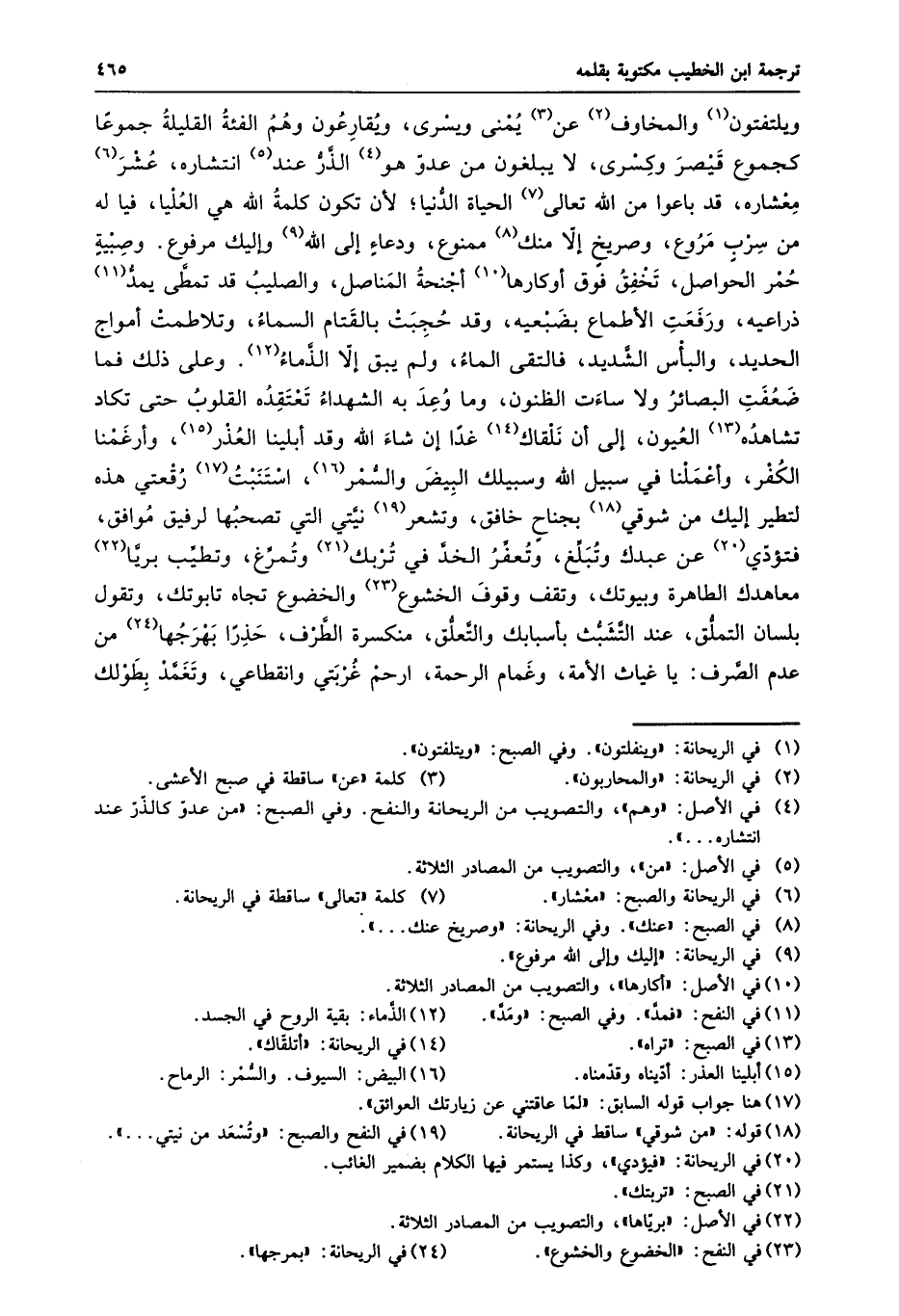 ويلتفتون «1» والمخاوف «2» عن «3» يمنى ويسرى، ويقارعون وهم الفئة القليلة جموعا كجموع قيصر وكسرى، لا يبلغون من عدوّ هو «4» الذّرّ عند «5» انتشاره، عشر «6» معشاره، قد باعوا من الله تعالى «7» الحياة الدّنيا؛ لأن تكون كلمة الله هي العليا، فيا له من سرب مروع، وصريخ إلّا منك «8» ممنوع، ودعاء إلى الله «9» وإليك مرفوع. وصبية حمر الحواصل، تخفق فوق أوكارها «10» أجنحة المناصل، والصليب قد تمطّى يمدّ «11» ذراعيه، ورفعت الأطماع بضبعيه، وقد حجبت بالقتام السماء، وتلاطمت أمواج الحديد، والبأس الشّديد، فالتقى الماء، ولم يبق إلّا الذّماء «12» . وعلى ذلك فما ضعفت البصائر ولا ساءت الظنون، وما وعد به الشهداء تعتقده القلوب حتى تكاد تشاهده «13» العيون، إلى أن نلقاك «14» غدا إن شاء الله وقد أبلينا العذر «15» ، وأرغمنا الكفر، وأعملنا في سبيل الله وسبيلك البيض والسّمر «16» ، استنبت «17» رقعتي هذه لتطير إليك من شوقي «18» بجناح خافق، وتشعر «19» نيّتي التي تصحبها لرفيق موافق، فتؤدّي «20» عن عبدك وتبلّغ، وتعفّر الخدّ في تربك «21» وتمرّغ، وتطيّب بريّا «22» معاهدك الطاهرة وبيوتك، وتقف وقوف الخشوع «23» والخضوع تجاه تابوتك، وتقول بلسان التملّق، عند التّشبّث بأسبابك والتّعلّق، منكسرة الطّرف، حذرا بهرجها «24» من عدم الصّرف: يا غياث الأمة، وغمام الرحمة، ارحم غربتي وانقطاعي، وتغمّد بطولك