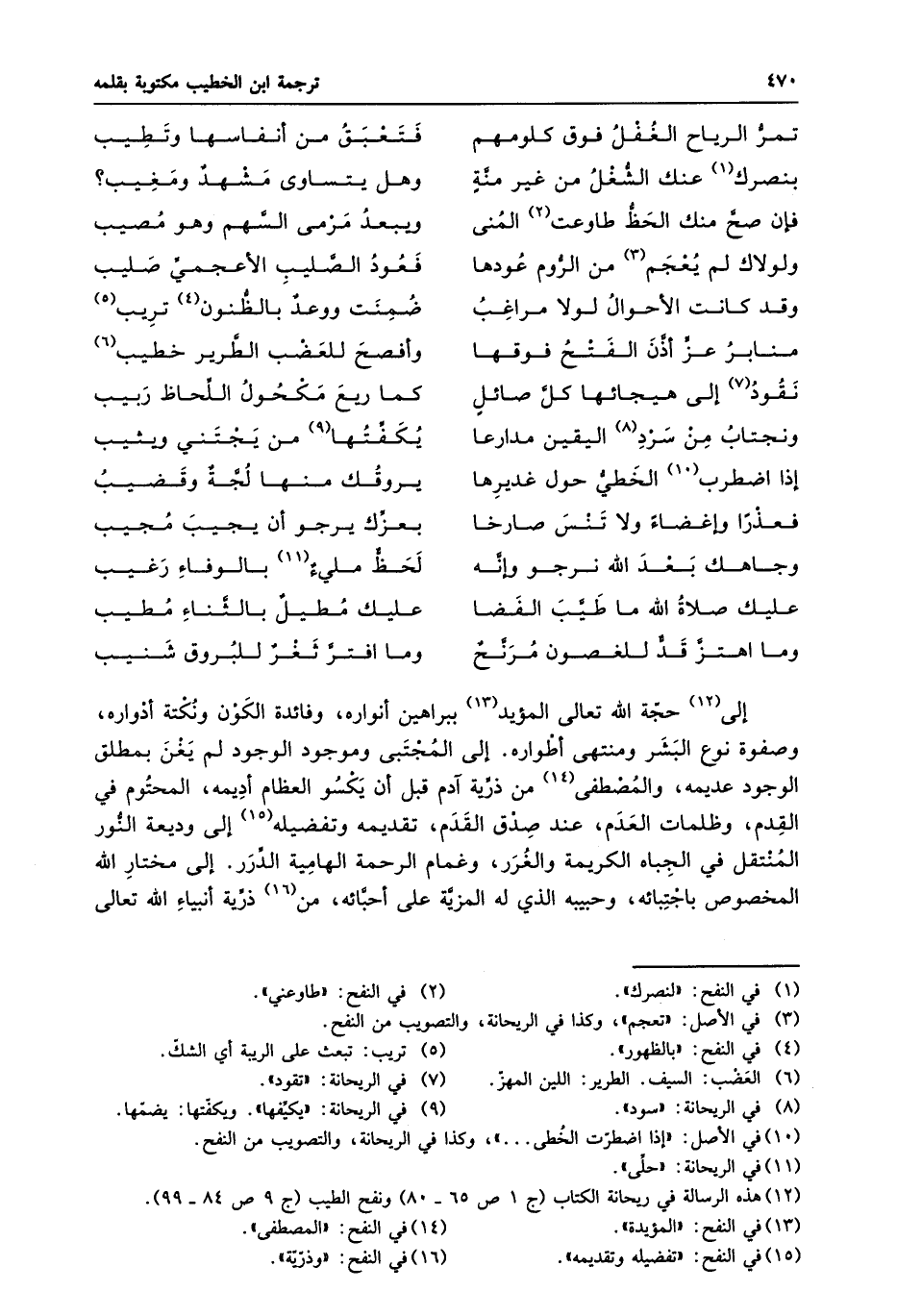 إلى «12» حجّة الله تعالى المؤيد «13» ببراهين أنواره، وفائدة الكون ونكتة أدواره، وصفوة نوع البشر ومنتهى أطواره. إلى المجتبى وموجود الوجود لم يغن بمطلق الوجود عديمه، والمصطفى «14» من ذرّية آدم قبل أن يكسو العظام أديمه، المحتوم في القدم، وظلمات العدم، عند صدق القدم، تقديمه وتفضيله «15» إلى وديعة النّور المنتقل في الجباه الكريمة والغرر، وغمام الرحمة الهامية الدّرر. إلى مختار الله المخصوص باجتبائه، وحبيبه الذي له المزيّة على أحبّائه، من «16» ذرّية أنبياء الله تعالى