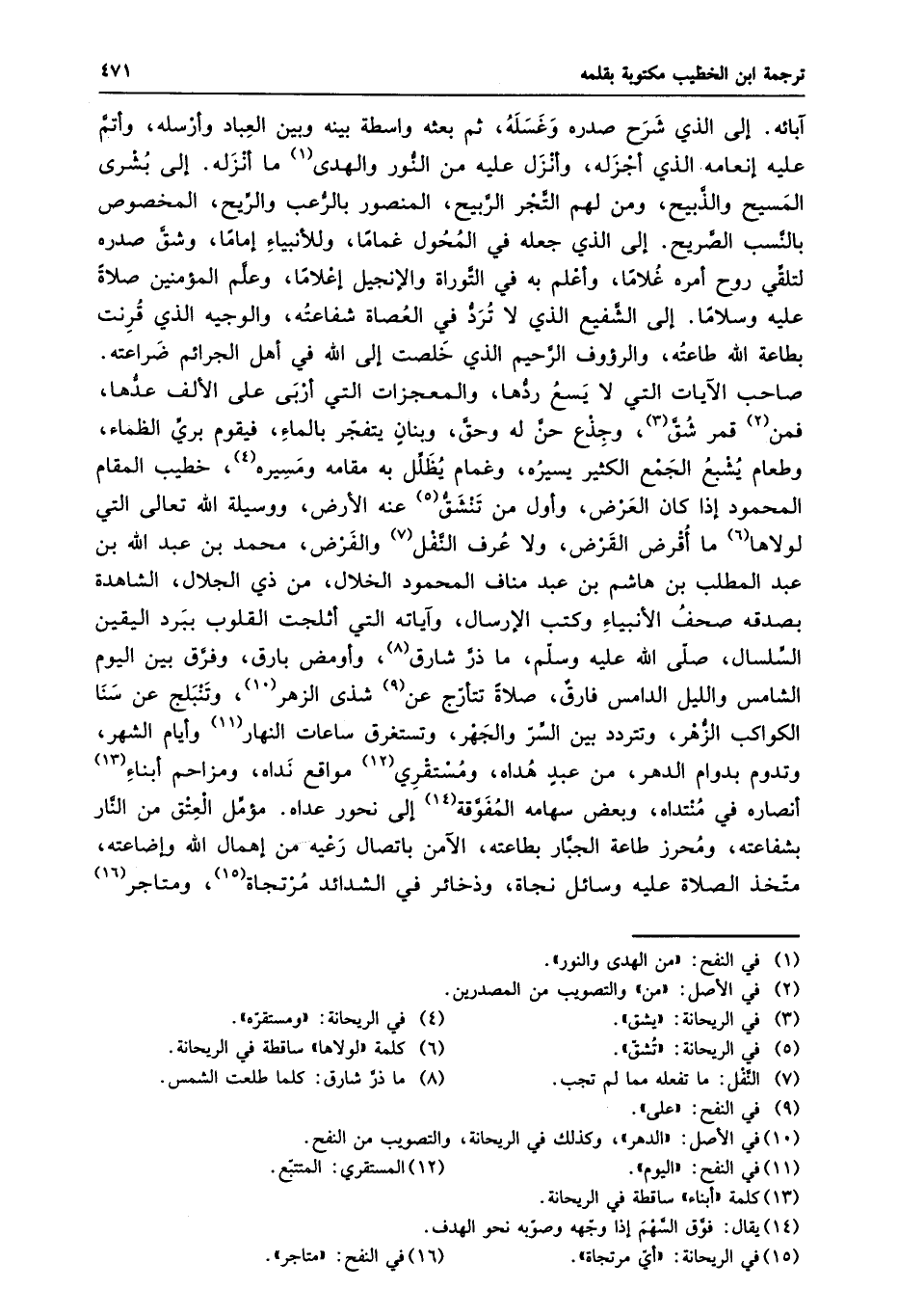 صاحب الآيات التي لا يسع ردّها، والمعجزات التي أربى على الألف عدّها، فمن «2» قمر شقّ «3» ، وجذع حنّ له وحقّ، وبنان يتفجّر بالماء، فيقوم بريّ الظماء، وطعام يشبع الجمع الكثير يسيره، وغمام يظلّل به مقامه ومسيره «4» ، خطيب المقام المحمود إذا كان العرض، وأول من تنشقّ «5» عنه الأرض، ووسيلة الله تعالى التي لولاها «6» ما أقرض القرض، ولا عرف النّفل «7» والفرض، محمد بن عبد الله بن عبد المطلب بن هاشم بن عبد مناف المحمود الخلال، من ذي الجلال، الشاهدة بصدقه صحف الأنبياء وكتب الإرسال، وآياته التي أثلجت القلوب ببرد اليقين السّلسال، صلّى الله عليه وسلّم، ما ذرّ شارق «8» ، وأومض بارق، وفرّق بين اليوم الشامس والليل الدامس فارق، صلاة تتأرّج عن «9» شذى الزهر «10» ، وتنبلج عن سنا الكواكب الزّهر، وتتردد بين السّرّ والجهر، وتستغرق ساعات النهار «11» وأيام الشهر، وتدوم بدوام الدهر، من عبد هداه، ومستقري «12» مواقع نداه، ومزاحم أبناء «13» أنصاره في منتداه، وبعض سهامه المفوّقة «14» إلى نحور عداه. مؤمّل العتق من النّار بشفاعته، ومحرز طاعة الجبّار بطاعته، الآمن باتصال رعيه من إهمال الله وإضاعته، متّخذ الصلاة عليه وسائل نجاة، وذخائر في الشدائد مرتجاة «15» ، ومتاجر «16»
