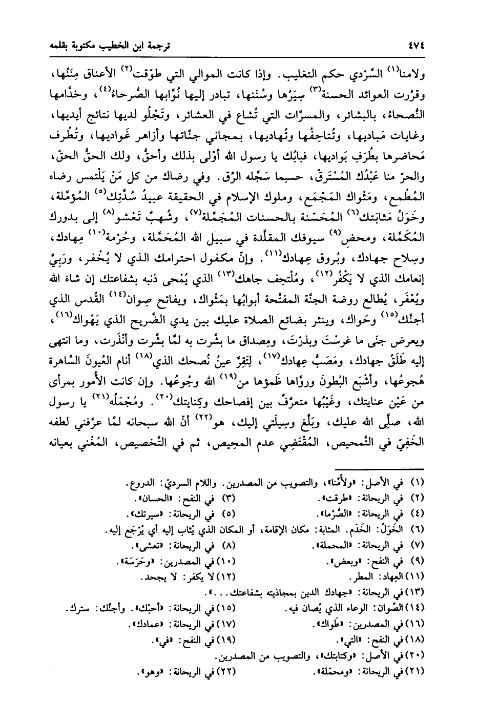 ولا منا «1» السّردي حكم التغليب. وإذا كانت الموالي التي طوّقت «2» الأعناق مننها، وقرّرت العوائد الحسنة «3» سيرها وسننها، تبادر إليها نوّابها الصّرحاء «4» ، وخدّامها النّصحاء، بالبشائر، والمسرّات التي تشاع في العشائر، وتجلو لديها نتائج أيديها، وغايات مباديها، وتتاحفها وتهاديها، بمجاني جنّاتها وأزاهر غواديها، وتطرف محاضرها بطرف بواديها، فبابك يا رسول الله أولى بذلك وأحقّ، ولك الحقّ الحقّ، والحرّ منا عبدك المسترقّ، حسبما سجّله الرّق. وفي رضاك من كل من يلتمس رضاه المطمع، ومثواك المجمع، وملوك الإسلام في الحقيقة عبيد سدّتك «5» المؤمّلة، وخول مثابتك «6» المحسّنة بالحسنات المجمّلة «7» ، وشهب تعشو «8» إلى بدورك المكمّلة، ومحض «9» سيوفك المقلّدة في سبيل الله المحمّلة، وحرمة «10» مهادك، وسلاح جهادك، وبروق عهادك «11» . وإنّ مكفول احترامك الذي لا يخفر، وربيّ إنعامك الذي لا يكفر «12» ، وملتحف جاهك «13» الذي يمحى ذنبه بشفاعتك إن شاء الله ويعفر، يطالع روضة الجنّة المفتّحة أبوابها بمثواك، ويفاتح صوان «14» القدس الذي أجنّك «15» وحواك، وينثر بضائع الصلاة عليك بين يدي الضّريح الذي يهواك «16» ، ويعرض جنى ما غرست وبذرت، ومصداق ما بشّرت به لمّا بشّرت وأنذرت، وما انتهى إليه طلق جهادك، ومصبّ عهادك «17» ، لتقرّ عين نصحك الذي «18» أنام العيون السّاهرة هجوعها، وأشبع البطون وروّاها ظمؤها من 1»