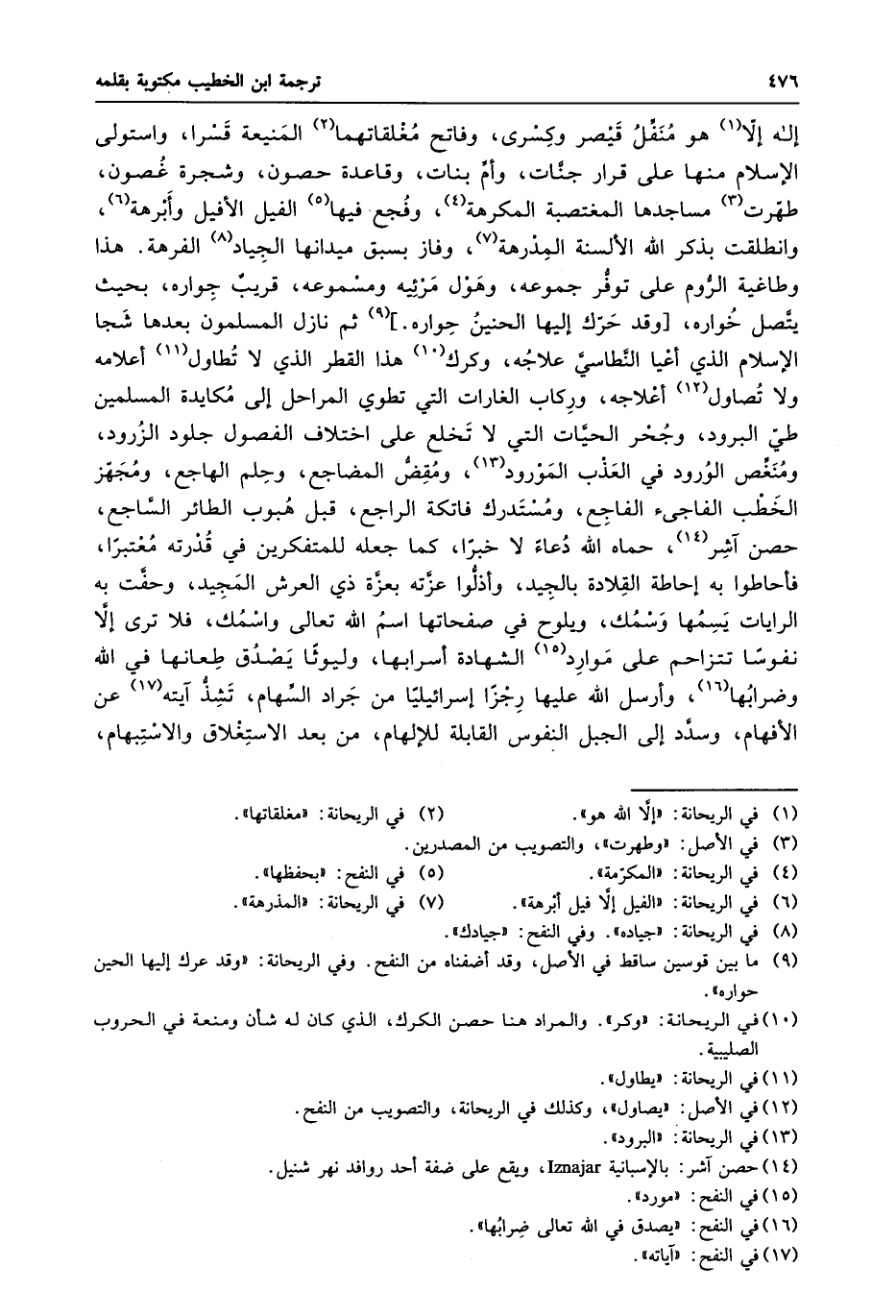 إله إلّا «1» هو منفّل قيصر وكسرى، وفاتح مغلقاتهما «2» المنيعة قسرا، واستولى الإسلام منها على قرار جنّات، وأمّ بنات، وقاعدة حصون، وشجرة غصون، طهّرت «3» مساجدها المغتصبة المكرهة «4» ، وفجع فيها «5» الفيل الأفيل وأبرهة «6» ، وانطلقت بذكر الله الألسنة المدرهة «7» ، وفاز بسبق ميدانها الجياد «8» الفرهة. هذا وطاغية الرّوم على توفّر جموعه، وهول مرئيه ومسموعه، قريب جواره، بحيث يتّصل خواره، [وقد حرّك إليها الحنين حواره.] «9» ثم نازل المسلمون بعدها شجا الإسلام الذي أعيا النّطاسيّ علاجه، وكرك «10» هذا القطر الذي لا تطاول «11» أعلامه ولا تصاول «12» أعلاجه، وركاب الغارات التي تطوي المراحل إلى مكايدة المسلمين طيّ البرود، وجحر الحيّات التي لا تخلع على اختلاف الفصول جلود الزرود، ومنغّص الورود في العذب المورود «13» ، ومقضّ المضاجع، وحلم الهاجع، ومجهّز الخطب الفاجىء الفاجع، ومستدرك فاتكة الراجع، قبل هبوب الطائر السّاجع، حصن آشر «14» ، حماه الله دعاء لا خبرا، كما جعله للمتفكرين في قدرته معتبرا، فأحاطوا به إحاطة القلادة بالجيد، وأذلّوا عزّته بعزّة ذي العرش المجيد، وحفّت به الرايات يسمها وسمك، ويلوح في صفحاتها اسم الله تعالى واسمك، فلا ترى إلّا نفوسا تتزاحم على موارد «15» الشهادة أسرابها، وليوثا يصدق طعانها في الله وضرابها «16» ، وأرسل الله عليها رجزا إسرائيليا من جراد السّهام، تشذّ آيته «17» عن الأفهام، وسدّد إلى الجبل النفوس القابلة للإلهام، من بعد الاستغلاق والاستبهام،